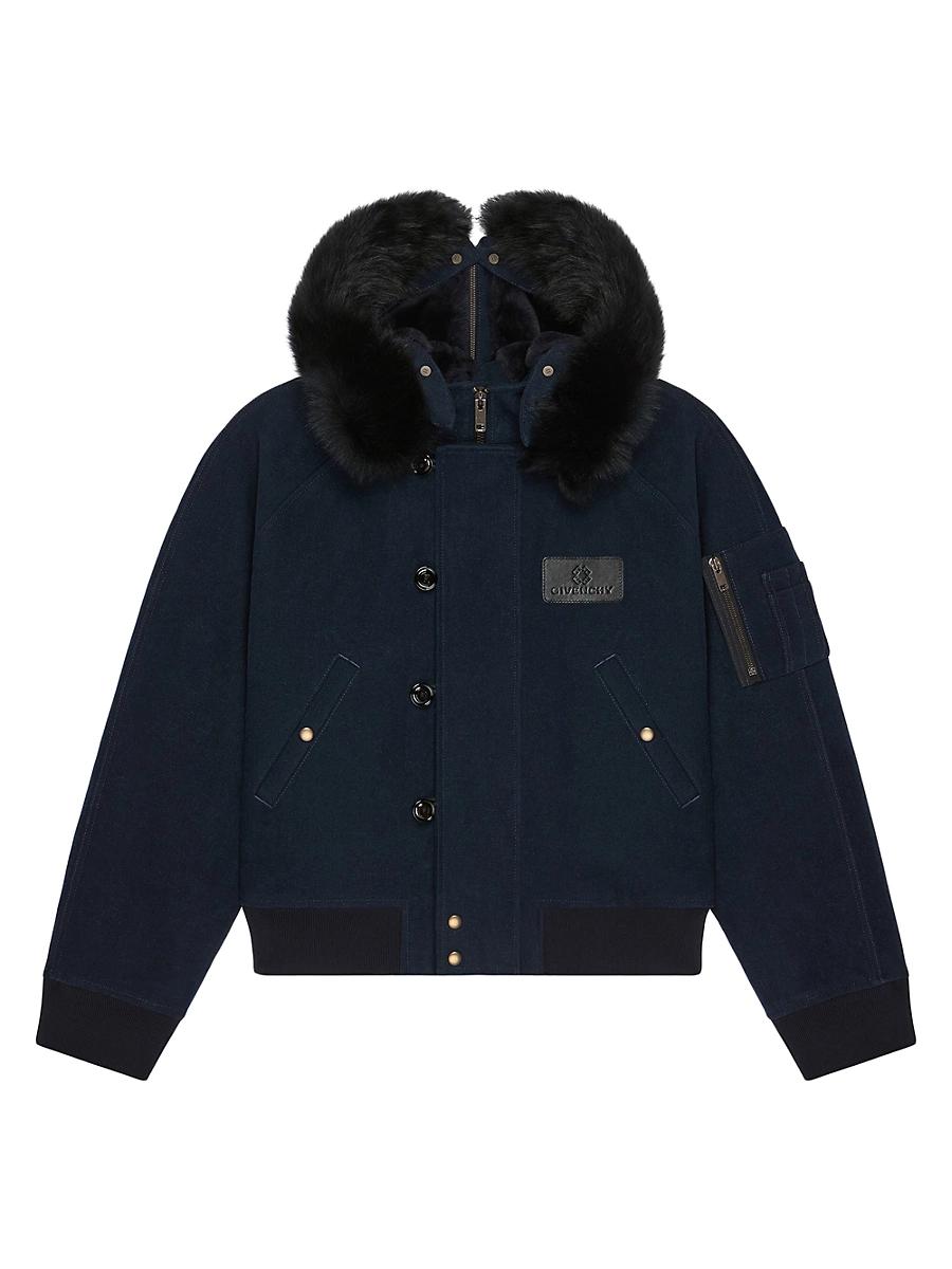 Hooded bomber in linen. Bomber in linen Stand up collar with fur zipped hood Givenchy patch in leather stitched on the chest Zipped and button closure Two side pockets One zipped multi-pocket on the left sleeve Elasticated knitted hem and cuffs Classic fit Composition: 90% linen, 10% cotton Lining: 100% viscose Fur Type: Ovis Aries Aries Fur Origin: Spain Imported. Lsd Rtw - Givenchy Rtw > Givenchy > Saks Fifth Avenue > Barneys. Givenchy. Color: Dark Blue. Size: 44.