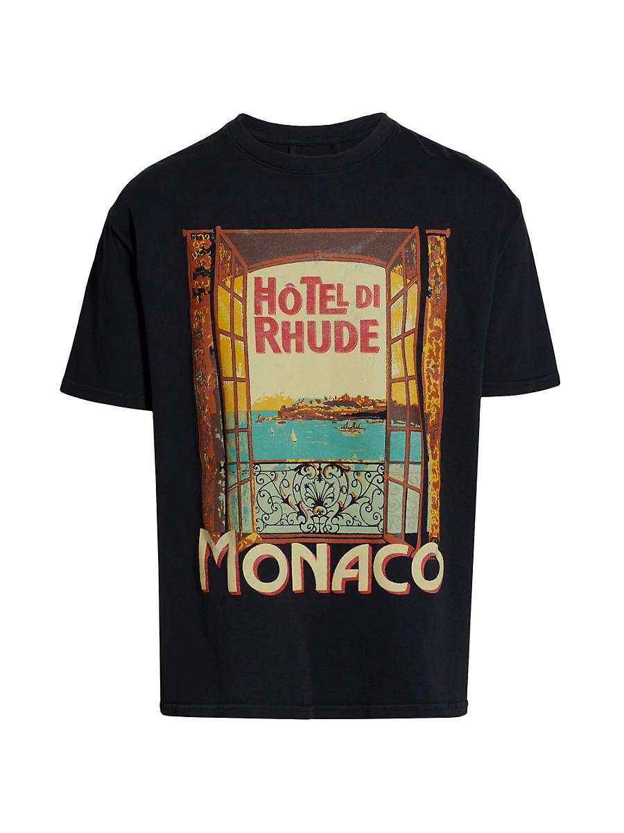 Rhude T-shirt featuring Monaco hotel graphic print Crew neckline Short sleeves Relaxed fit Pullover style Cotton Made in USA