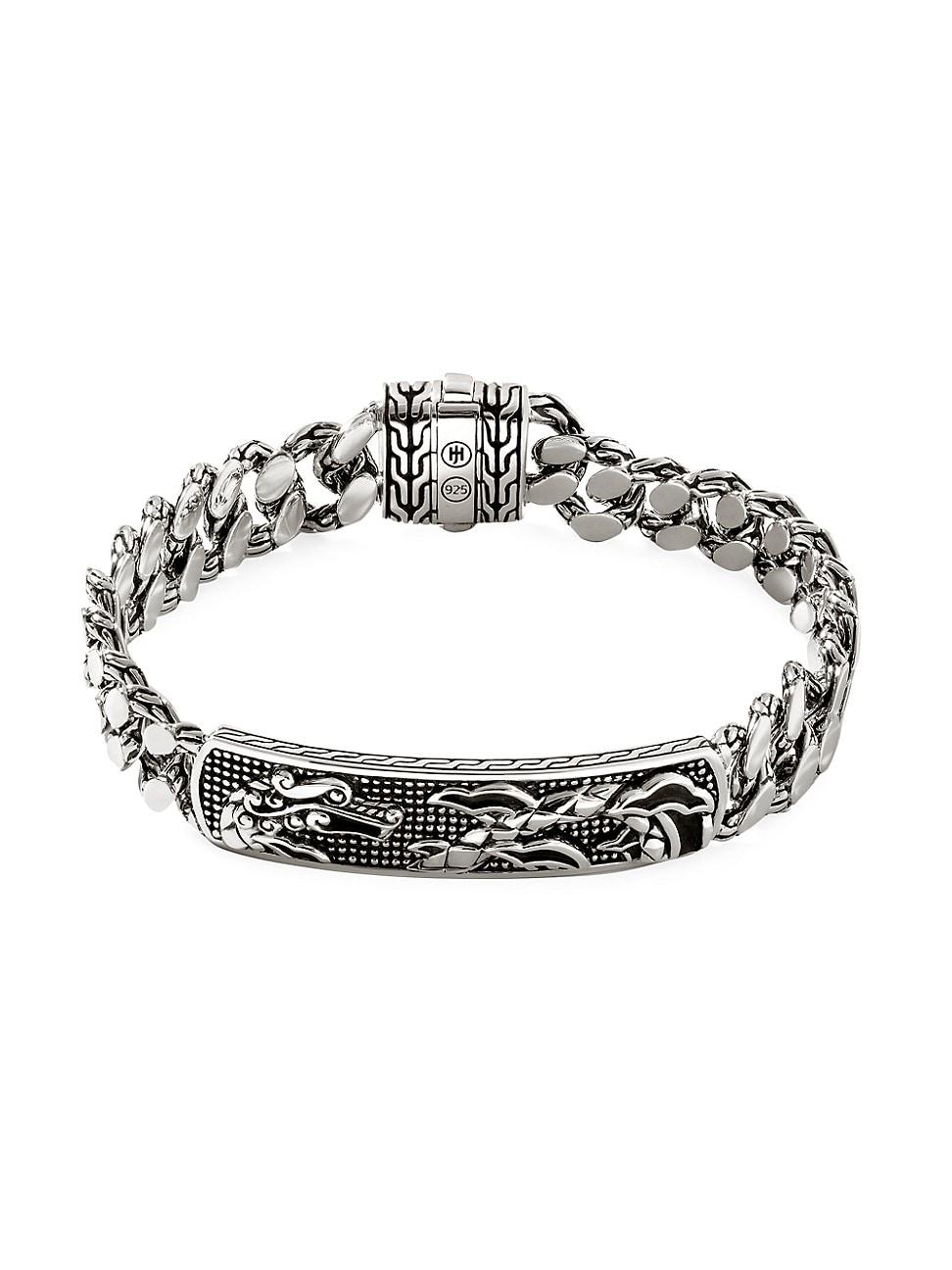 From the Indonesia Collection. John Hardys Legedns Naga curb link bracelet is crafted of durable sterling silver. Detailed with an engraved bar, the design fastens with a pusher box clasp. Sterling silver Box clasp Imported SIZE About 11L. Men Accessories - Jewelry > John Hardy > Saks Fifth Avenue > Barneys. John Hardy. Color: Silver. Size: Medium.