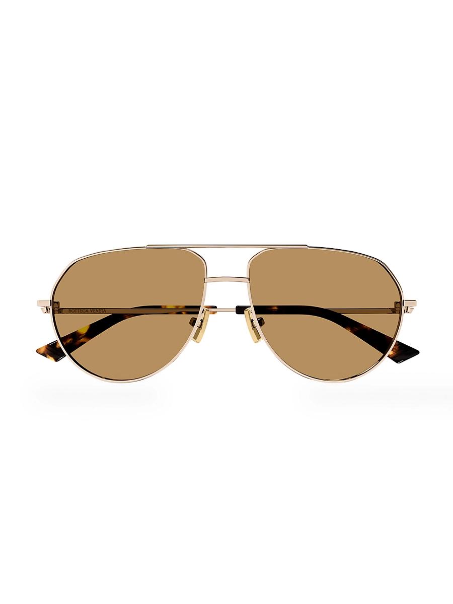 Bottega Veneta BV1302S aviator sunglasses in metal Lens/bridge/temple (in mm): 56-19-130 Solid-color lenses Double-nose bridge Adjustable nose pads Temples with engraved logo lettering Thin arms Curved, capped temple tips Metal 100% UVA/UVB protection Made in Italy