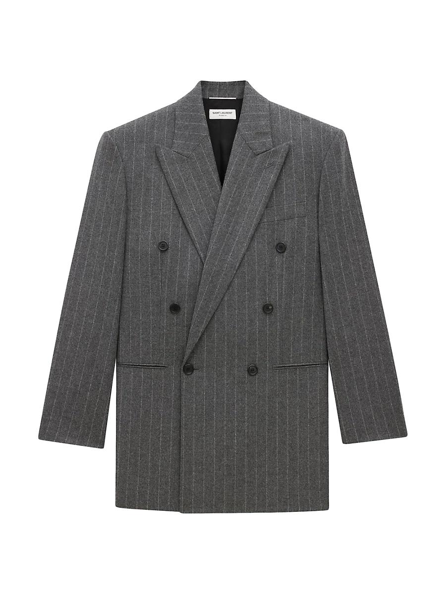 Double-breasted, six-button jacket made with certified wool, featuring a peaked lapel and 90s cut. Silk lining Double-breasted Six-button closure Two jetted pockets at the front One welt pocket at the chest Two inner jetted pockets Peaked lapel Four-button cuffs Padded shoulders Single back vent Wool Made in Italy. Lsd Rtw - Saint Laurent Rtw > Saint Laurent > Saks Fifth Avenue > Barneys. Saint Laurent. Color: Gris Craie. Size: 40.