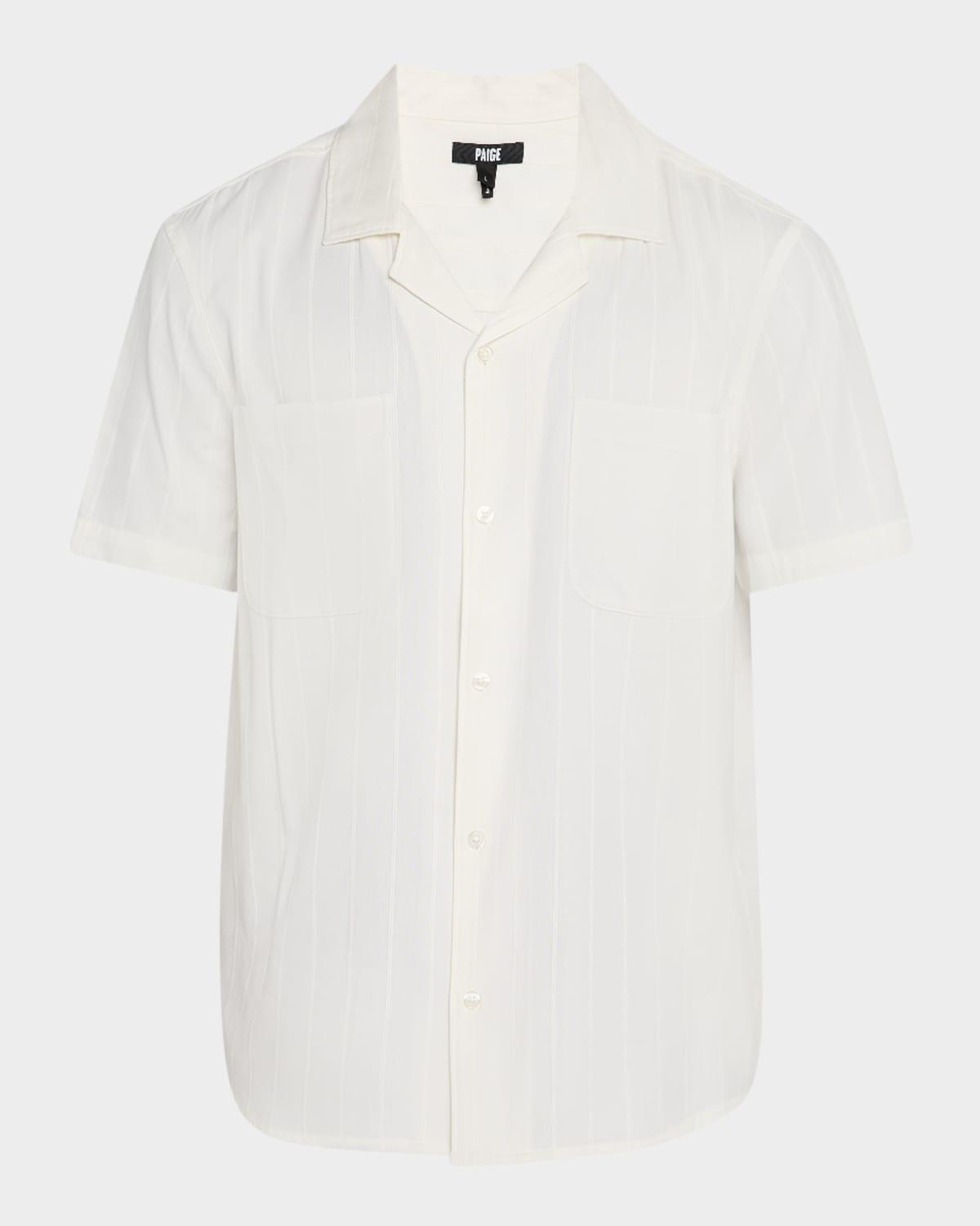 The Jacobson camp shirt from Paige highlights a textured stripe design and chest patch pockets. Camp collar Short sleeves Chest patch pocket Front button closure 60% viscose/ 40% cotton Machine wash Imported SIZE & FIT Regular fit Model measurements: 62 tall, 40 chest, 31 waist Model is wearing a US size Medium. Mens Denim & Contemp - Contemp Denim And Bottom > Paige > Saks Fifth Avenue > Barneys. Paige. Color: Varnished Ivory. Size: Small.