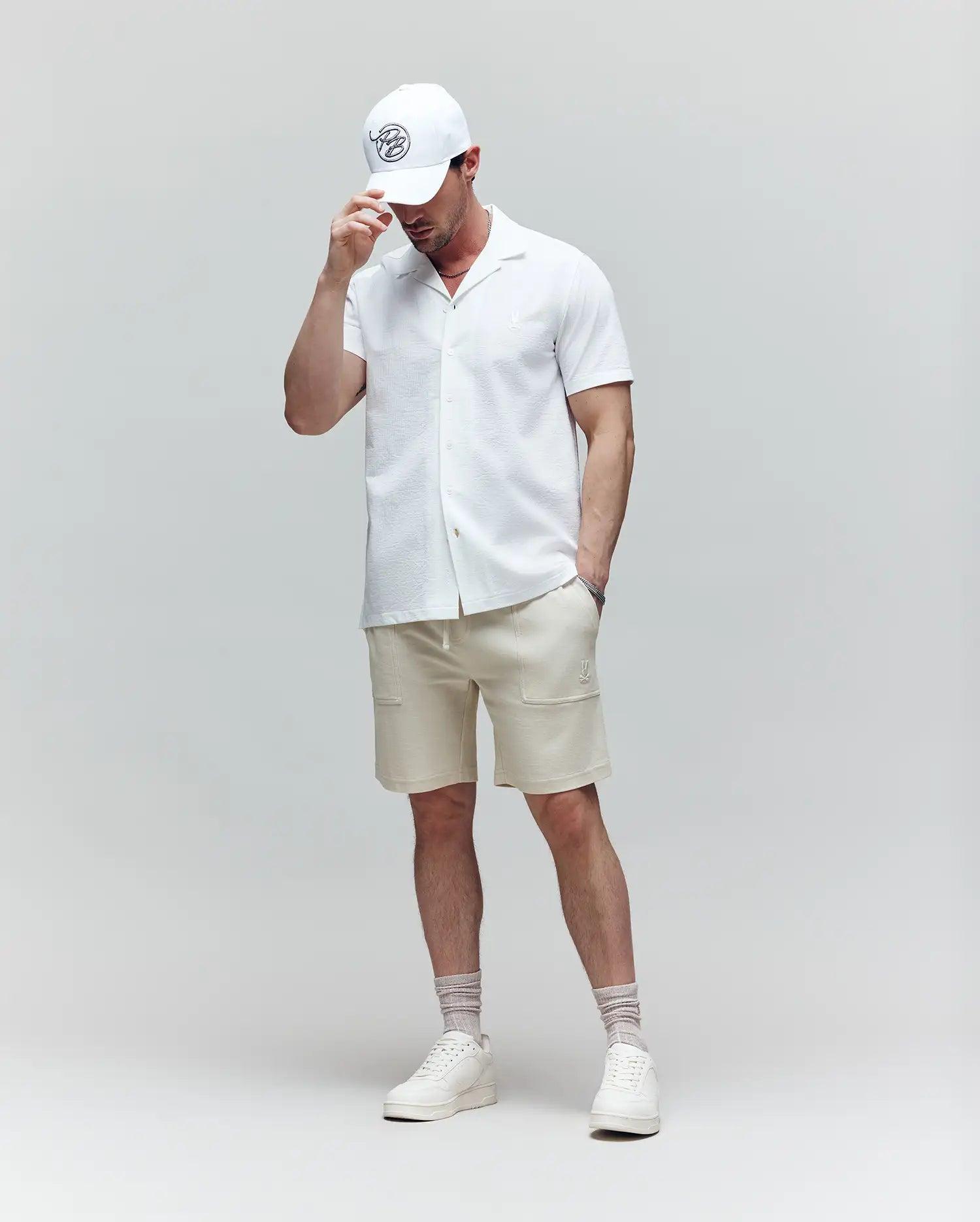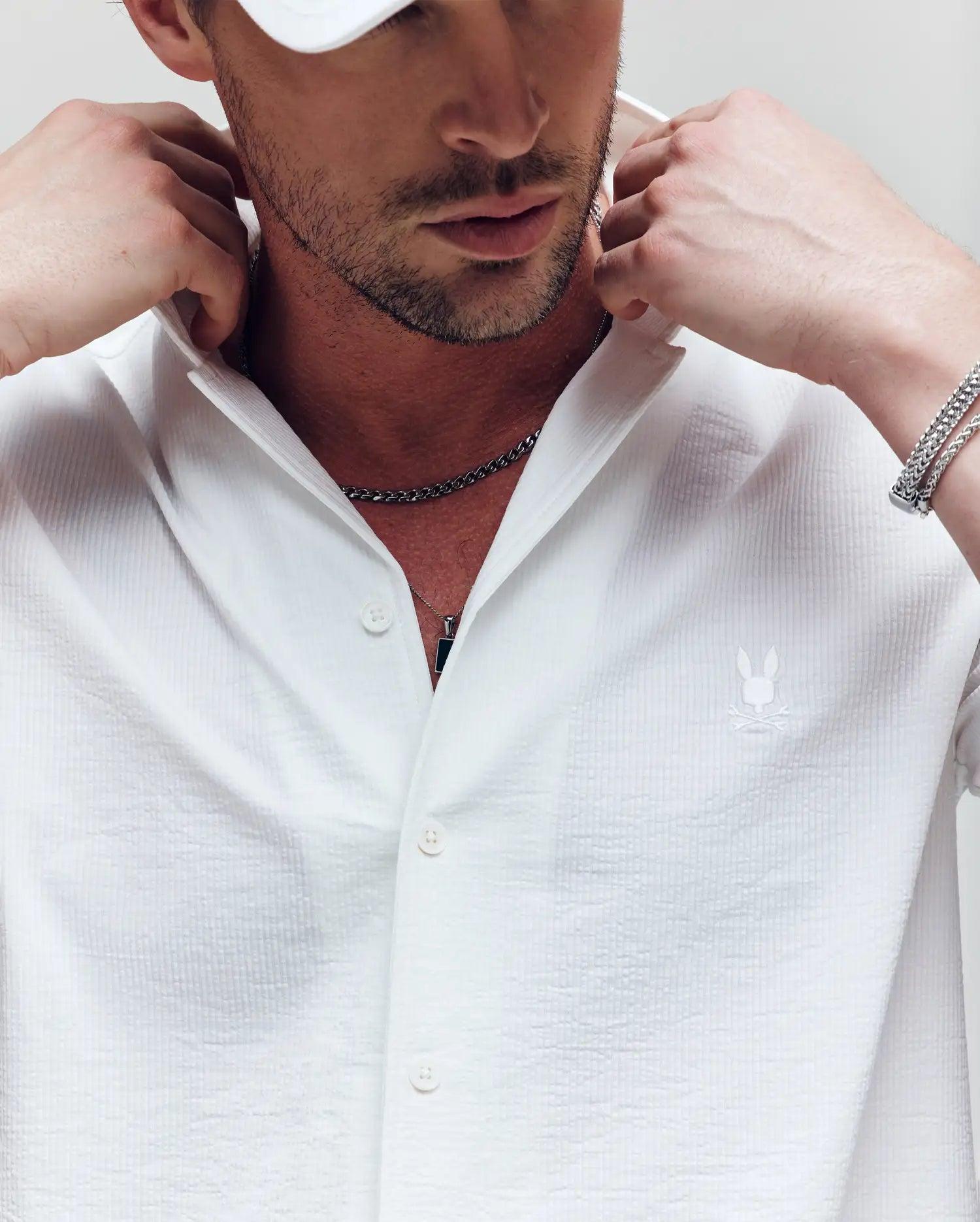 Is seersucker a weird word? Yeah, kind of. Do we care? With a shirt this good, of course not. Featuring a cabana collar and a premium cotton blend flush with texture, your summer just got a lot hotter. Thank us later. Also available for Big and Tall Knit - 55% cotton 45% polyesterMade in ChinaSeersuckerCabana camp collarEmbroidered BunnyMother-of-Pearl buttonsModel height is 5'10 (approx. 178cm) and is wearing a size medium.