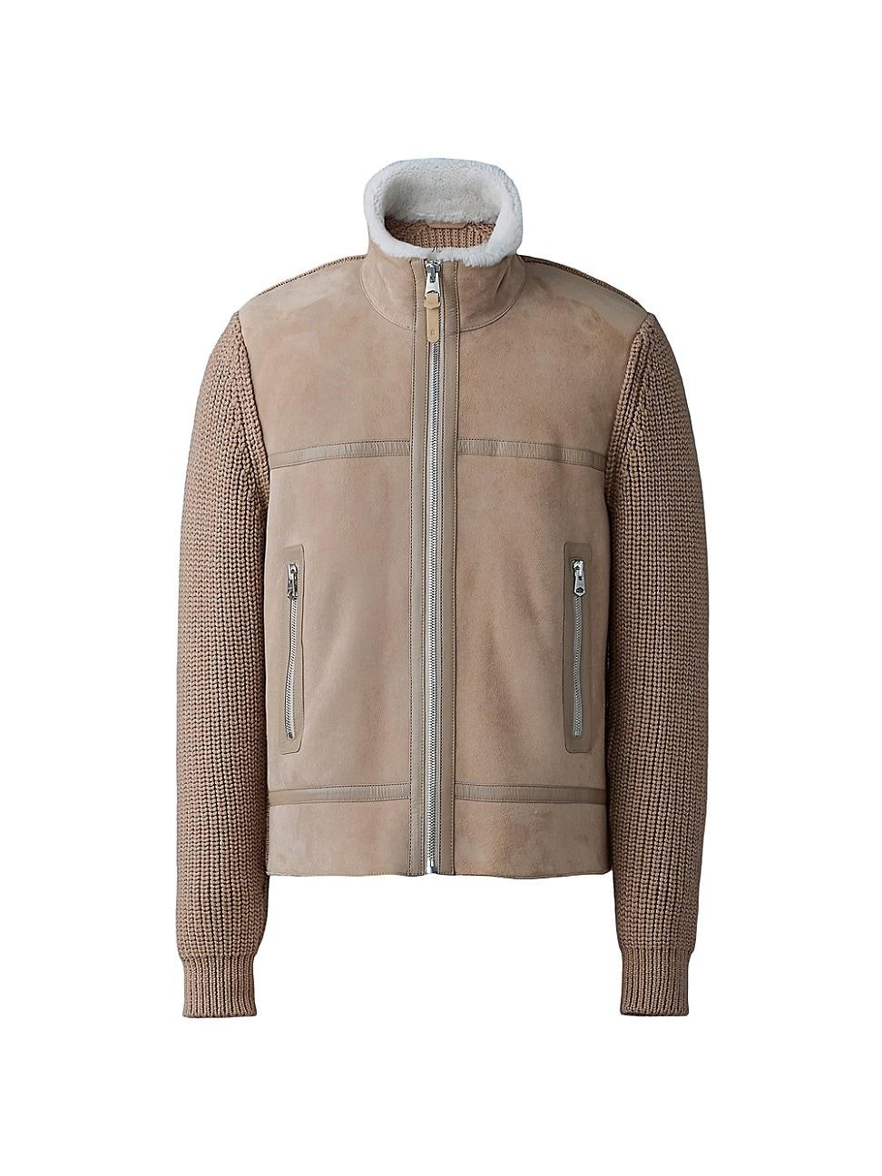 Mackage Jonathan shearling jacket with knit sleeves and back Contains real fur: Dyed lamb shearling (Turkey) Spread collar Center front zip closure with leather tape Zip pockets at waist Regular fit Wool/shearling/leather Dry clean, leather method dry cleaning Imported