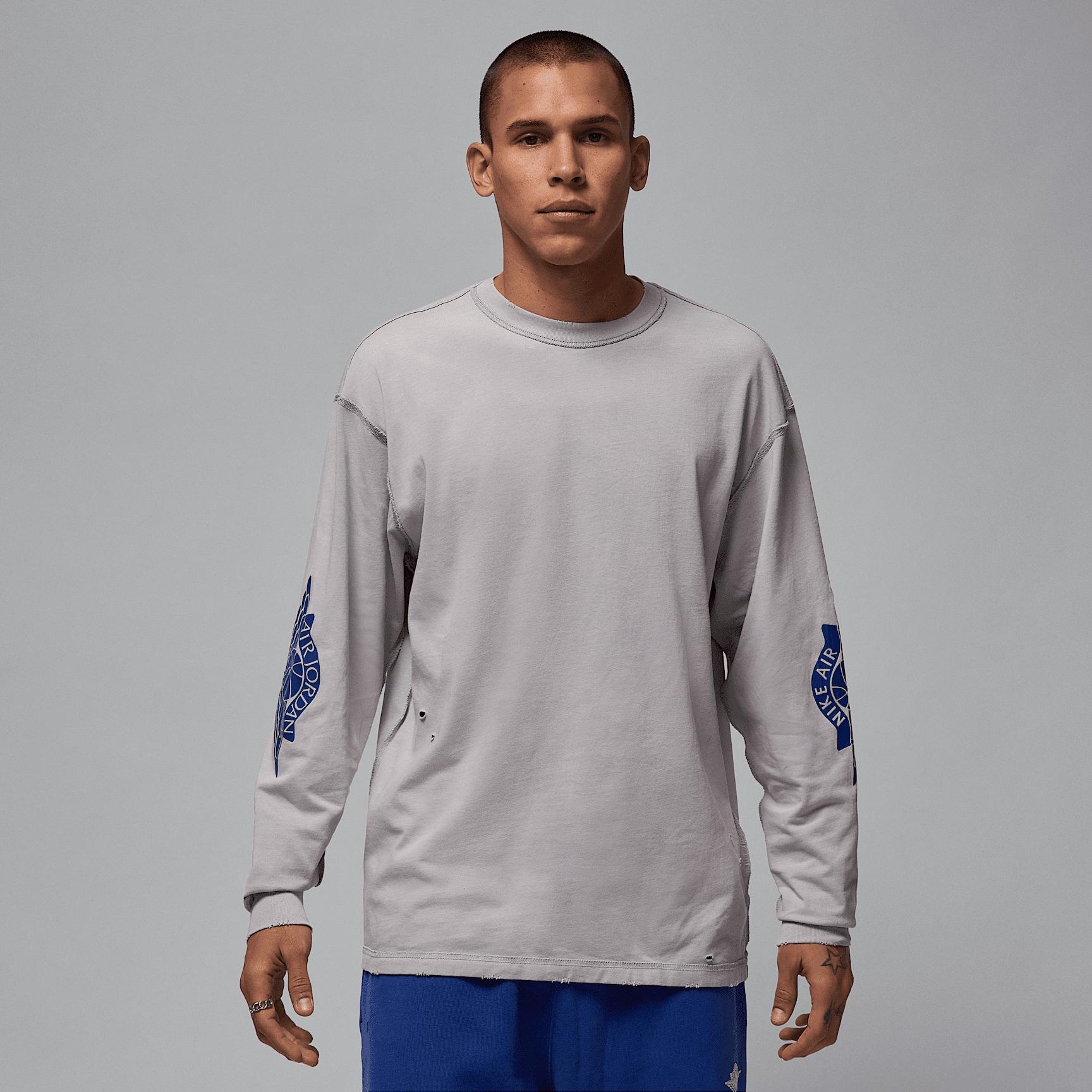 Celebrate the imperfections that make us unique with Jordans Rare Air collection. Made from heavyweight cotton, this structured long-sleeve tee pairs distressed details with an allover wash for a faded, lived-in look. Product Details:100% cotton. Machine wash. Imported. Style: IB3134; Color: Light Smoke Grey/Deep Royal; Size: S; Gender: Male; Age Group: Adult | Jordan Rare Air Mens Long-Sleeve T-Shirt in Grey, Size: Small | IB3134-077
