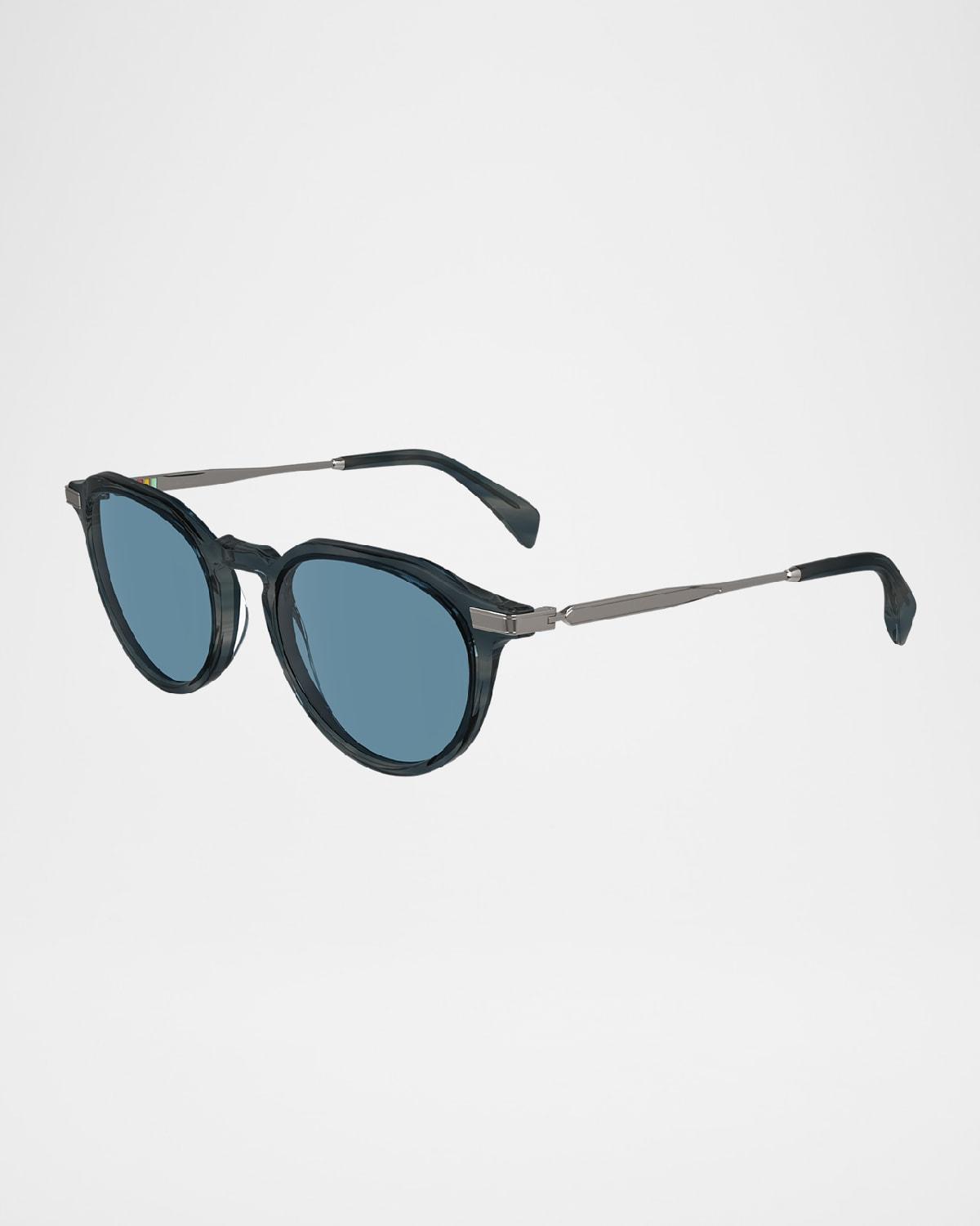 Paul Smith "Keats" round sunglasses in acetate and metal Lens/bridge/temple (in mm): 51-20-145 Solid-color lenses Keyhole nose bridge Temples with engraved logo Curved, capped temple tips Acetate/metal Wipe clean 100% UVA/UVB protection Made in Italy Proposition 65 warning for California residents