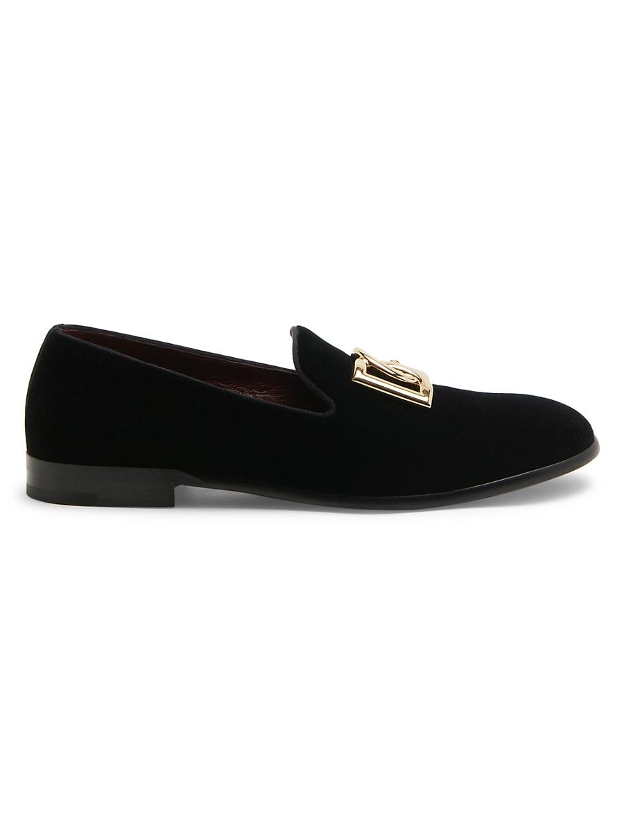 Soft velvet and a glamorous goldtone logo plaque elevate these classic smoking shoes. Cotton upper Almond toe Slip-on style Leather/cotton lining Leather/synthetic sole Made in Italy ABOUT THE BRAND Mediterranean-inspired prints and luxe silhouettes are mainstays of the Italian label, launched in 1985 by Domenico Dolce and Stefano Gabbana. The eye-catching menswear line includes a lineup of sleek clothing, shoes and accessories. Mens Shoes - Designer Shoes > Dolce & gabbana > Saks Fifth Avenue > Barneys. Dolce & Gabbana. Color: Nero. Size: 11.