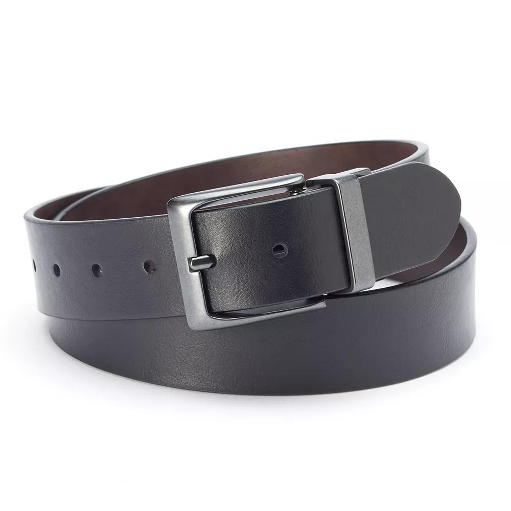 Khakis? Jeans? Shorts? Thanks to its reversible styling, this mens Levis belt complements everything in your closet. In black, brown.Reversible styling switches between brown and blackCut-edge detailGunmetal buckle1.5-inches wideTop: synthetic leatherLining: coated leatherImported Color: Charcoal. Gender: male. Age Group: adult. Pattern: Solid.
