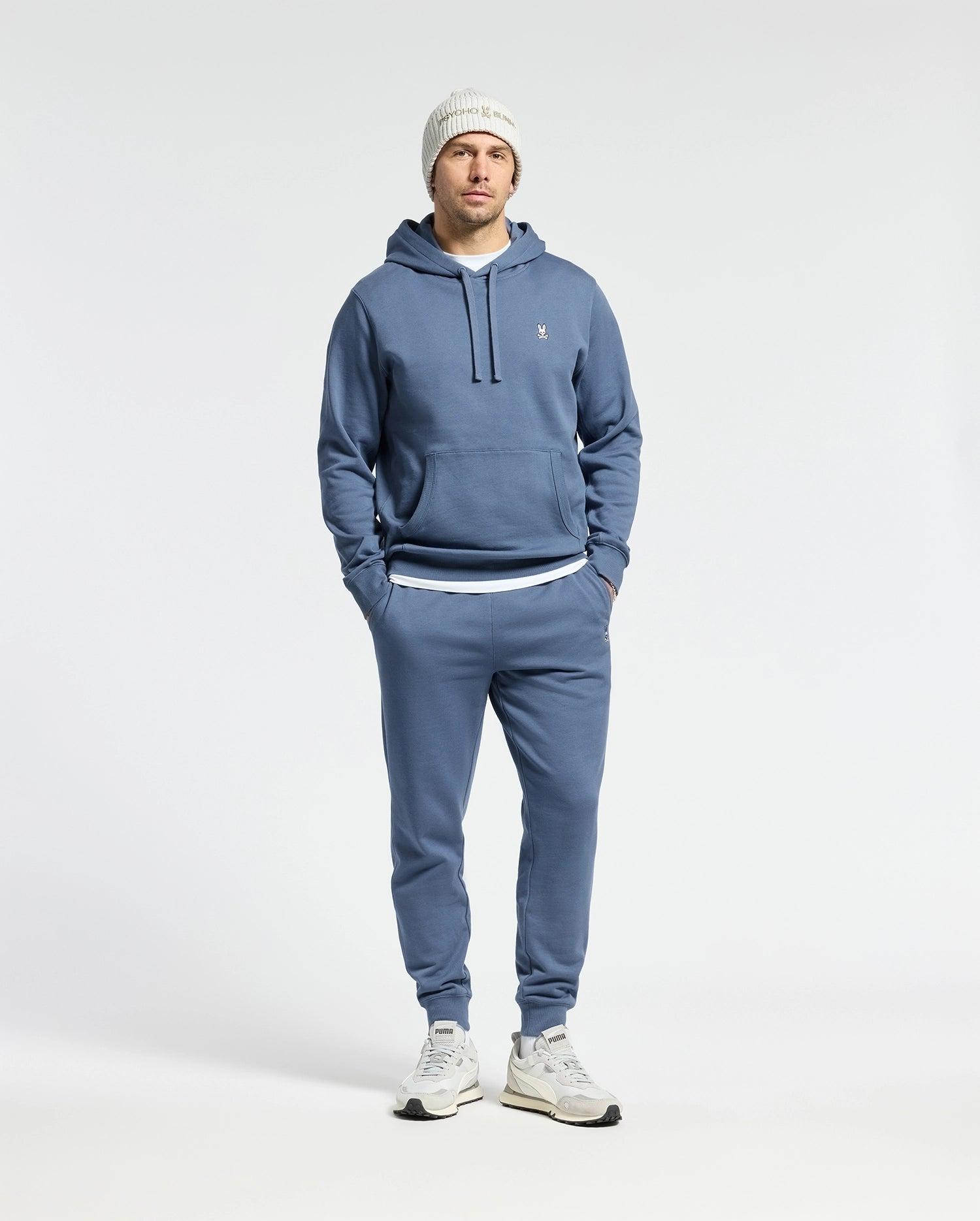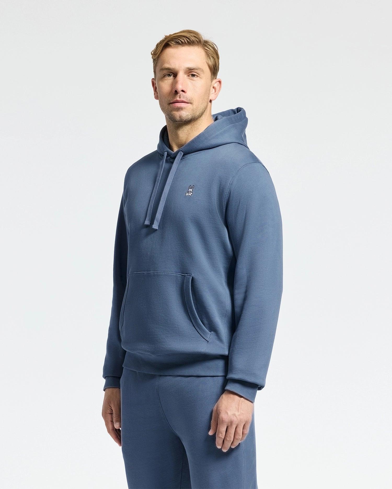 The French terry men's Levy essential hoodie is knit from a 100% cotton, for a sheen that shows and a soft comfort that's all for you. Complete the look with the Levy essential fleece sweatpants. Also available for kids.Complete the matching set Also available for KidsAlso available for Big and TallKnit - 100% cottonMade in ChinaRegular fit4K stitch-embroidered BunnyDrawstring at hoodKangaroo pocketRib knit cuffs and hemModel height is 6'0 (approx. 183cm) and is wearing a size medium.
