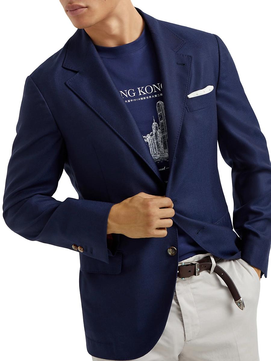 Lightweight cashmere twill deconstructed blazer. 3-roll-2 closure with horn buttons Notched lapel Welt pockets with flap, ticket pocket and chest pocket Cuffs have four horn buttons and functional buttonholes Double back vent Two interior pockets with button closure and pen holder Cupro half lining Drop 7 Request dry cleaning at specialist cleaners only, do not bleach. Do not tumble dry, iron at low temperature 100% Cashmere Made in Italy. Lsd Rtw - Brunello Cucinelli Rtw > Brunello Cucinelli > Saks Fifth Avenue > Barneys. Brunello Cucinelli. Color: Navy Blue. Size: 42.