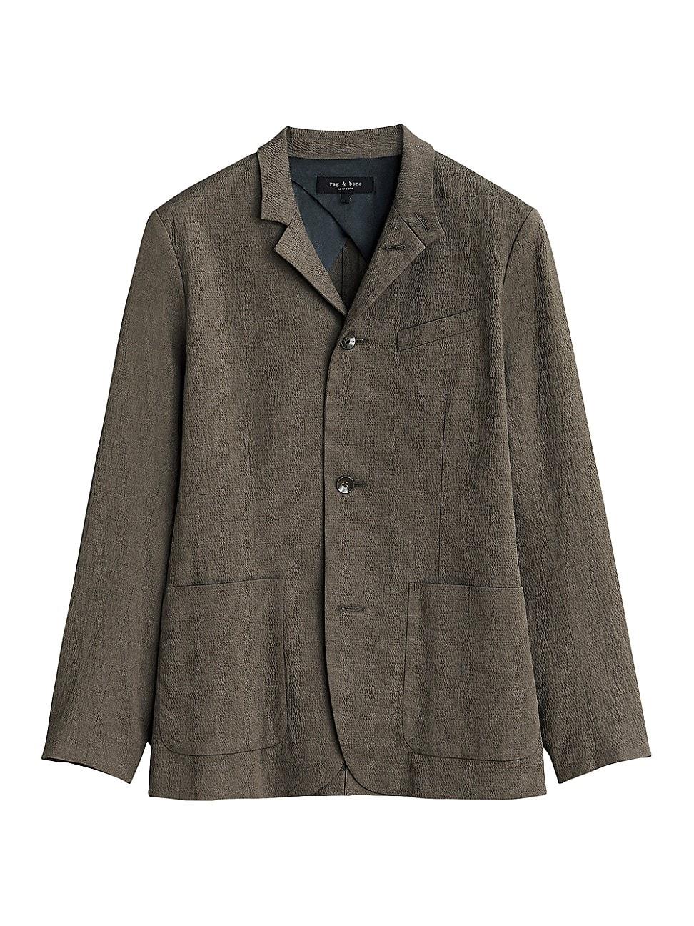 In a tailored fit, Rag & Bones seersucker blazer features a buttoned up lapel and military tab collar closure. Signature interior front facing details and half lined back body. Notched lapels Long sleeves, buttoned cuffs Front button closure 99% cotton/1% elastane Machine wash Imported SIZE & FIT About 29.5 from shoulder to hem Model measurements: 62 tall, 40 chest Model is wearing a US size Medium ABOUT THE BRAND In 2002, rag & bone founder Marcus Wainwright combined his British heritage with a downtown-New York aesthetic to set the tone for the label. At the heart of the edgy-yet-laid-back brand is its focus on quality craftsmanship and attention to detail. The epitome of cool, off-duty style, its no wonder the signature denim and easy knits are favored by many. Mens Denim & Contemp - Contemp Denim And Bottom > Rag & Bone > Saks Fifth Avenue > Barneys. rag & bone. Color: Black. Size: 48.
