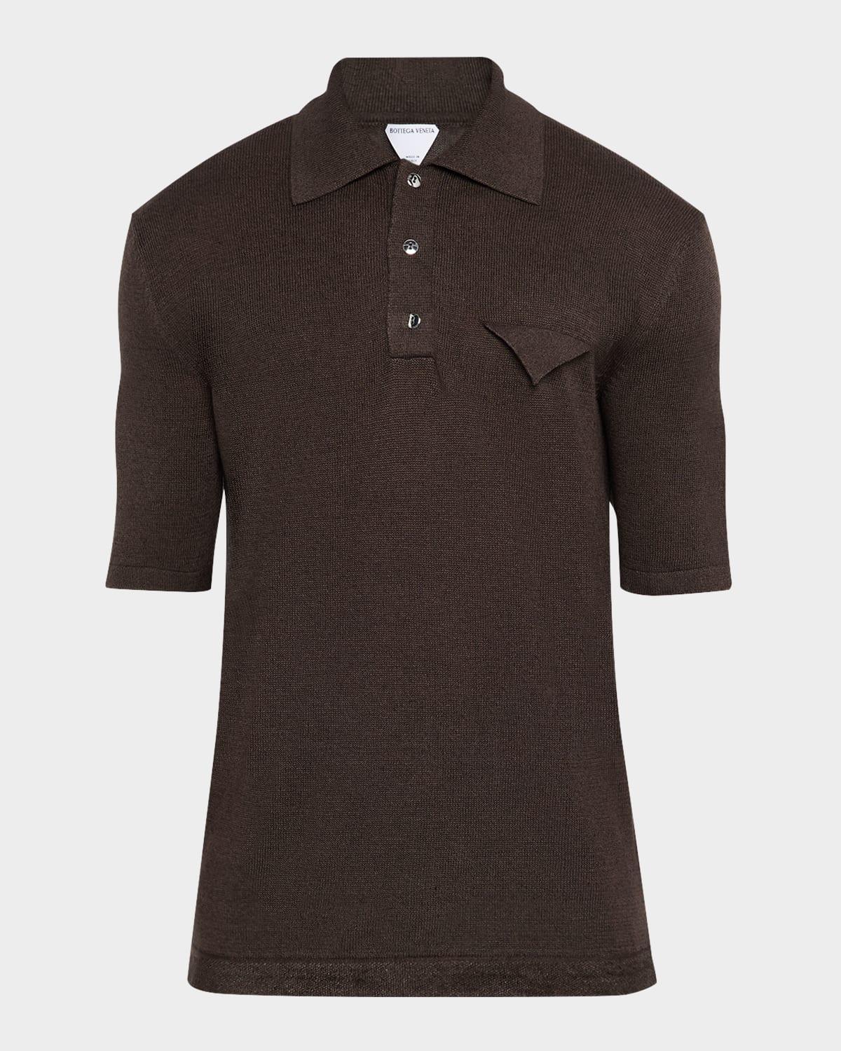 Bottega Veneta Triangle Polo in Beige Self: 70% linen 30% cotton Collar: 65% linen 27% cotton 7% polyamide 1% elastane. Made in Italy. Hand wash. Partial front button closure. Front flap pocket. Lightweight knit fabric. BOTT-MS30. 740733V2X00. About the designer: Bottega Veneta – inspiring individuality with innovative craftmanship since 1966. Creativity lies at the heart of all that we do. Born in Vicenza the house is rooted in Italian culture yet maintains a truly global outlook. An inclusive brand with exclusive products Bottega Veneta is as much of a feeling as it is an aesthetic.