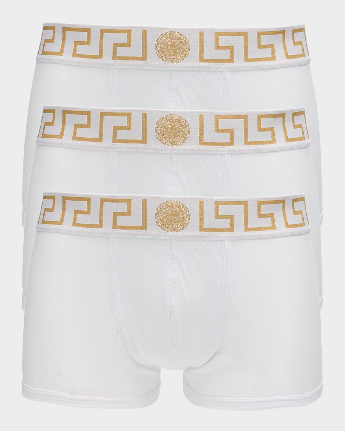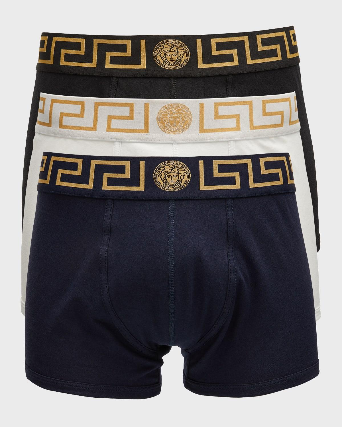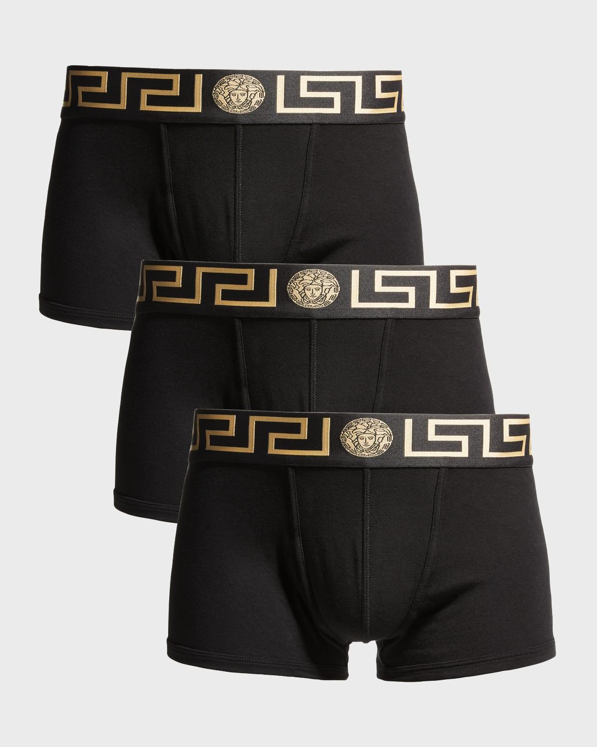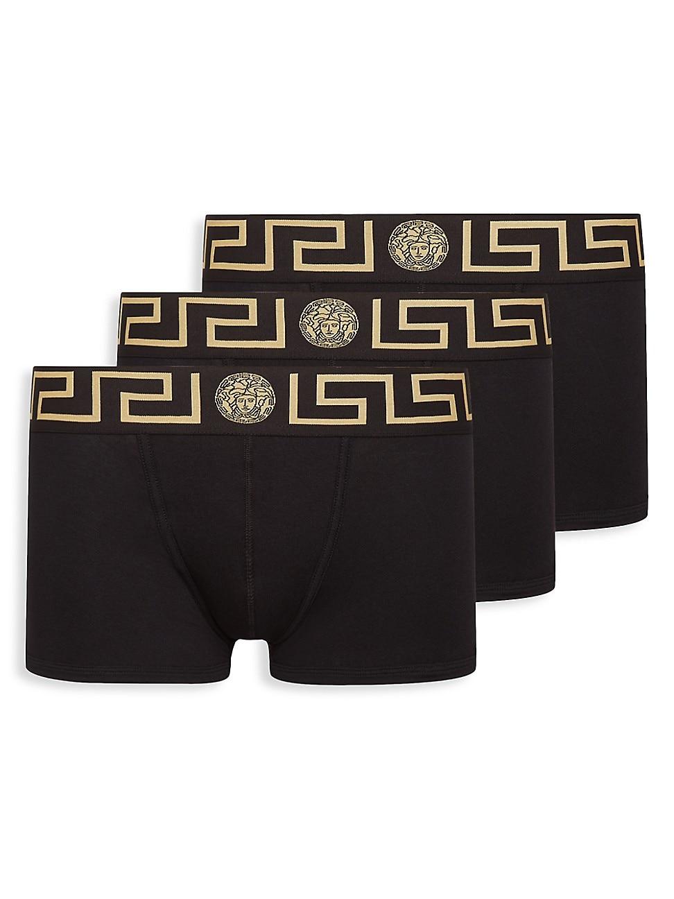 These boxers feature an elastic waistband featuring the brands logo. Three pairs of boxers Elastic waistband 94% cotton/6% elastane Hand wash Made in Italy ABOUT THE BRAND Founded in 1978, Versace is instantly recognizable by the signature Medusa head logo, chosen by founder Gianni Versace for its Greek symbolism. The Italian label is known for its luxe, bold clothing, sneakers, shoes and accessories-think gilding, oversized logos and punchy prints. Since taking over artistic direction, Giannis sister Donatella Versace has maintained the brands strong identity, with a renewed vision to give customers the ultimate freedom to express themselves. Men Accessories - Underwear > Versace > Saks Fifth Avenue > Barneys. Versace. Color: Black Gold. Size: Large.