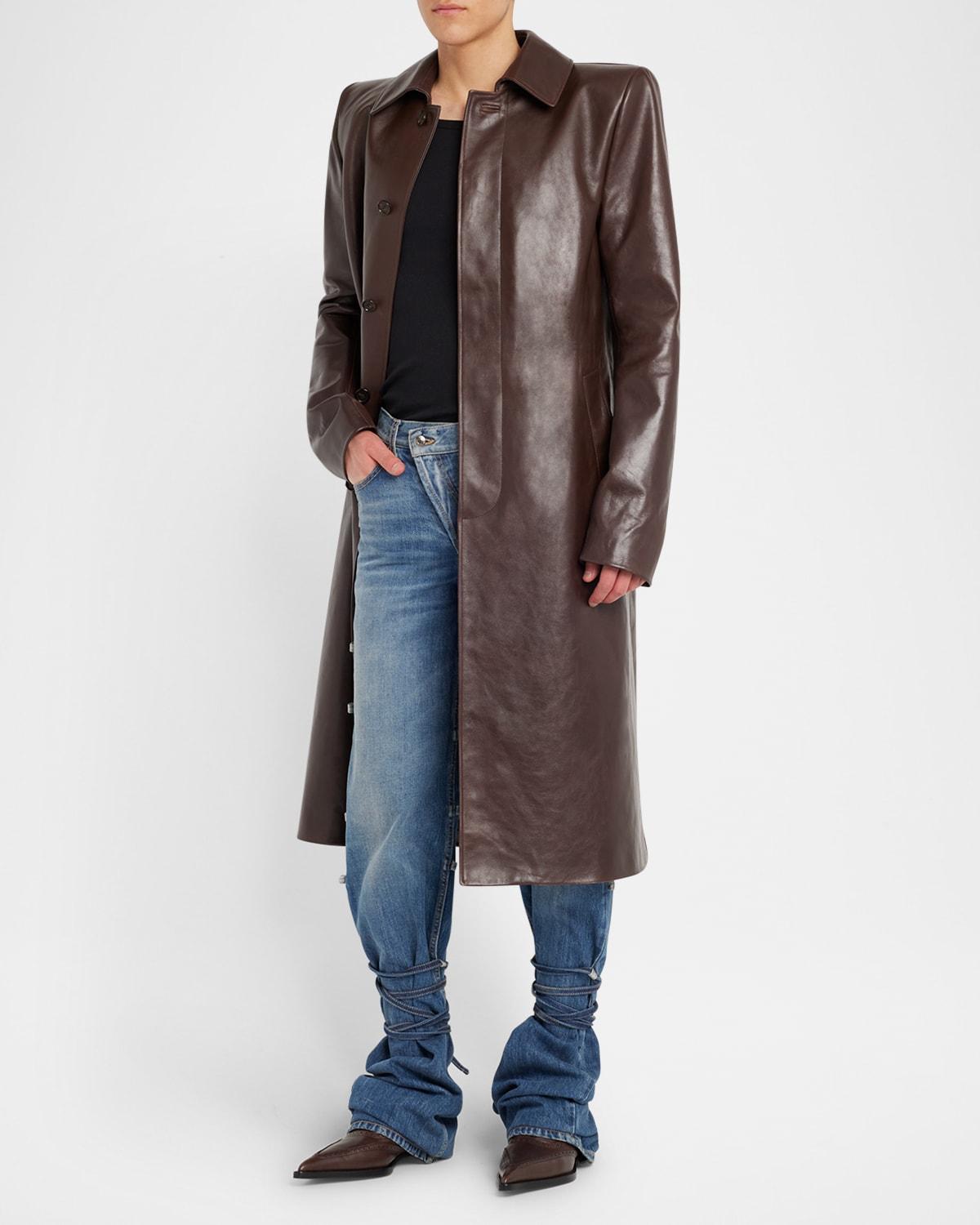 Alexander McQueen raincoat in smooth calf leather Point collar Stacked shoulders Concealed front fastening Side welt pockets Reomovable cord wrap at waist Dry clean Made in Italy Model is 6'1"/185cm.