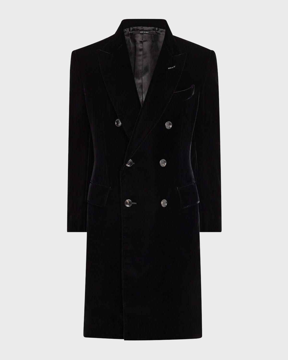 TOM FORD cocktail jacket in compact lightweight velvet Peak lapel; double-breasted front Chest pocket and flap front pockets Slit cuffs Longline silhouette Tailored, slim fit Back vent Viscose/silk Lining: Cupro/silk Made in Italy Model is 6'1"/185cm.