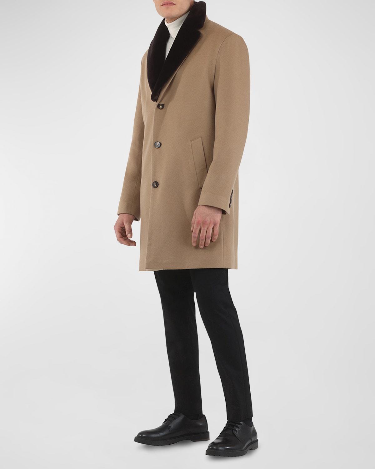 Gorski Loro Piana cashmere (Italy) coat featuring a detachable dyed lamb shearling (South Africa) collar Approx. 38"L from shoulder to hem Notch lapels; single-breasted front Long sleeves; button cuffs Side welt pockets Regular fit Hem falls below the hip Center-back vented hem Button closure Cashmere Lining: Polyester Professional cleaning recommended Imported Model is 5'10"/177cm.