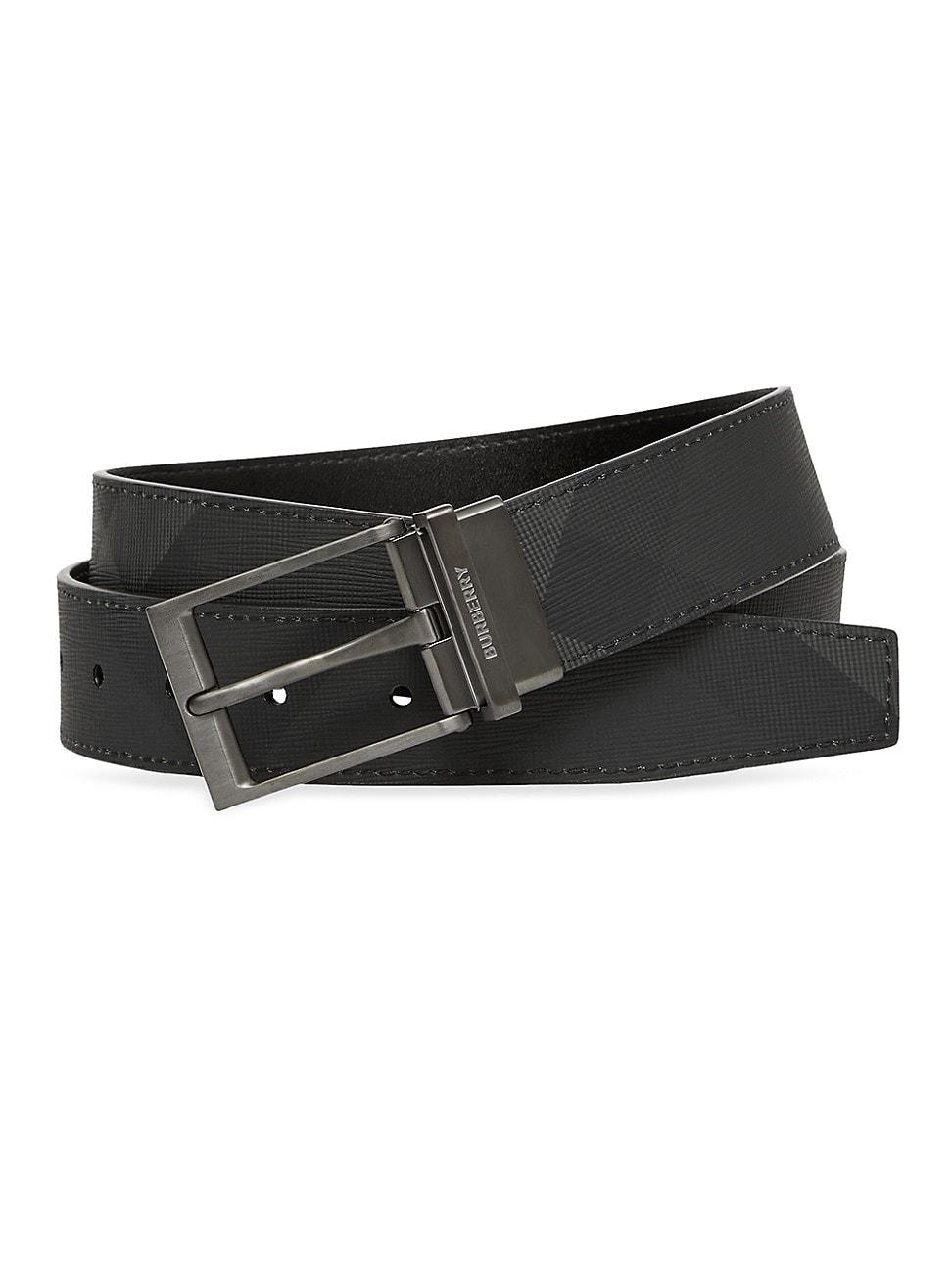 Burberrys Louis belt reverses from the iconic woven check pattern to smooth leather. Secured with a logo-engraved buckle, the accessory includes hand-painted edges and engraved logo lettering. Reverses from woven check to smooth leather Silvertone hardware Made in Italy ABOUT THE BRAND Founded in 1856 by 21-year-old Thomas Burberry, the brand set out with a mission to stylishly protect against British weather-and Burberrys iconic trench coat was born. In the 1920s, its renowned check pattern was introduced as the coats lining. Today, under Creative Director Daniel Lee, the heritage brand continues to evolve and create timelessly classic pieces. Men Accessories - Leather Goods > Burberry > Saks Fifth Avenue > Barneys. Burberry. Color: Dark Charcoal Black. Size: 38.