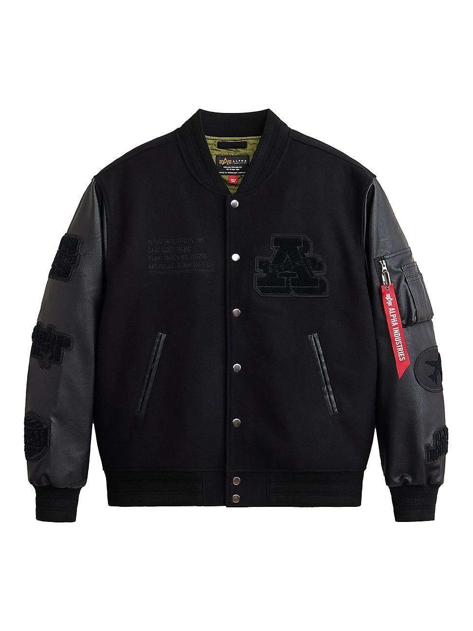 Styled with leather sleeves, the MA-1 bomber jacket from Alpha Industries features varsity logo patches and welt pockets. Bomber collar Long sleeves, banded cuffs Side welt pockets Front-snap closure 50% wool/50% polyester Dry clean Imported SIZE & FIT Model measurements: 62 tall, 40 chest, 31 waist Model is wearing a US size Medium. Mens Modern Coll & Outer - Contemporary Outerwear > Alpha Industries > Saks Fifth Avenue > Barneys. Alpha Industries. Color: Black. Size: Medium.