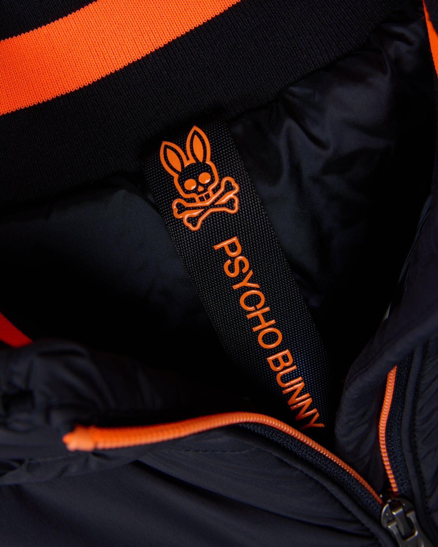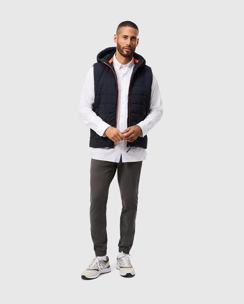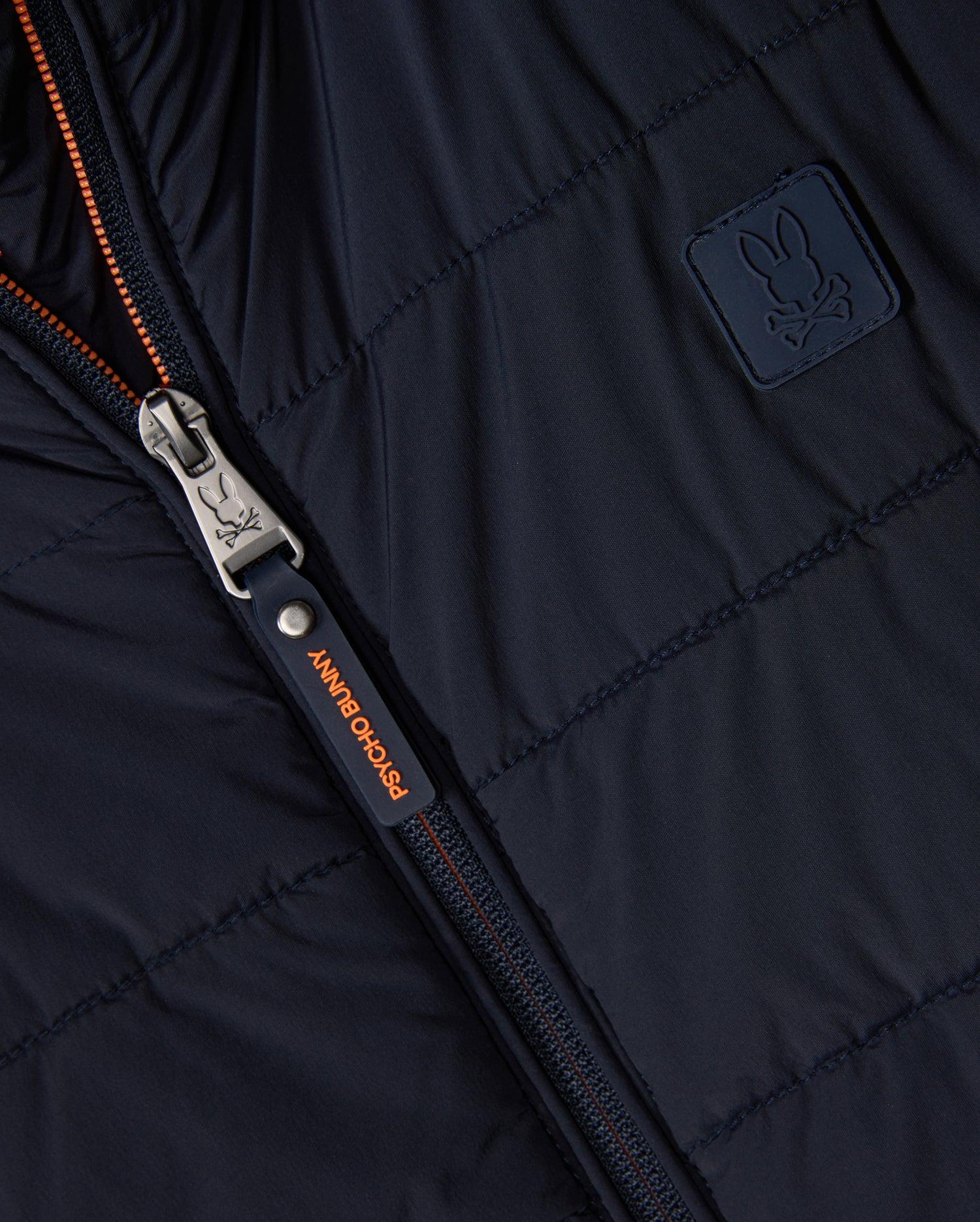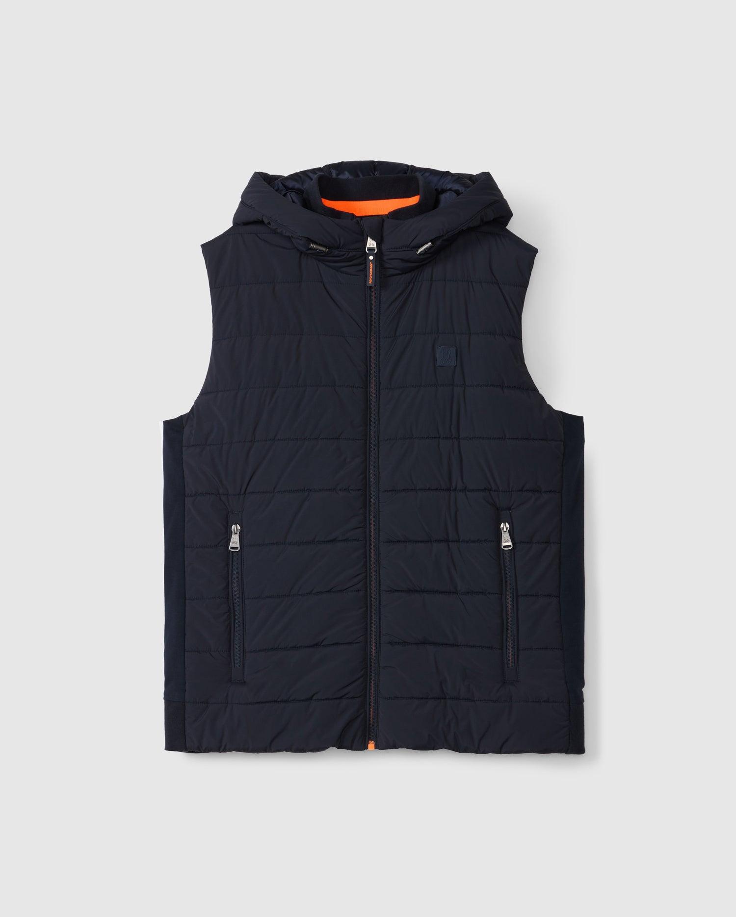 The quilted Malcolm Mixed Media vest is insulated and consists of satin and a knit cotton materials. Bright contrasting trims, a silicone Bunny patch, and logo-engraved hardware shows the level of detail that went into crafting it.92% nylon 8% spandex, lining - knit: 96% cotton 4% elastaneMade in ChinaPadded vest jacketHood