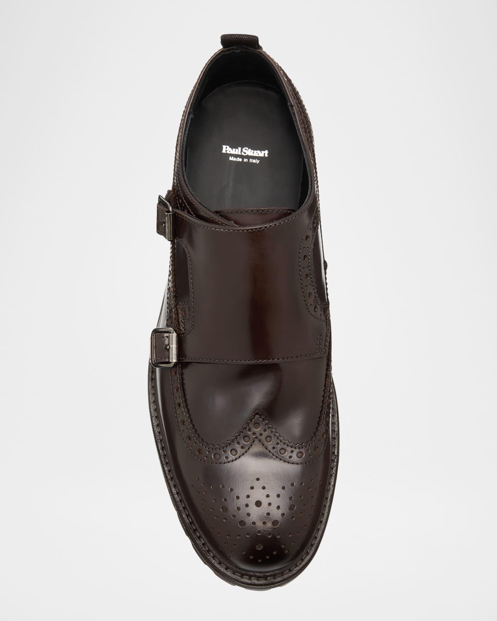 Paul Stuart "Marcelo Cordovan" monk strap loafers in smooth calf leather with brogue detailing 1.00 in / 25 mm chunky heel Round wingtip toe Double-buckle monk straps Leather lining Backstay pull tab Lugged rubber outsole Spot clean Made in Italy Proposition 65 warning for California residents