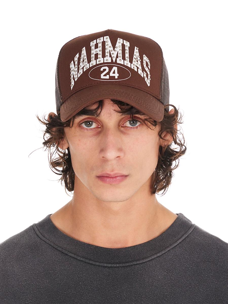 Nahmias Marque trucker hat features bold logo lettering with studded accents, back mesh panels, and an adjustable strap. Adjustable Cotton/nylon Spot clean Imported. Men Accessories - Contemporary Accessories > Nahmias > Saks Fifth Avenue > Barneys. Nahmias. Color: Brown.