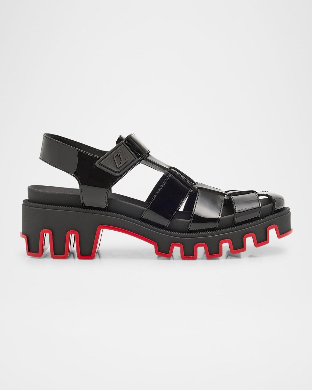 Christian Louboutin "Meduzz Dune 35" fisherman sandals in patent leather Chunky heel Round toe Adjustable ankle strap Chunky lug sole Signature Loubi red TPU outsole Made in Spain