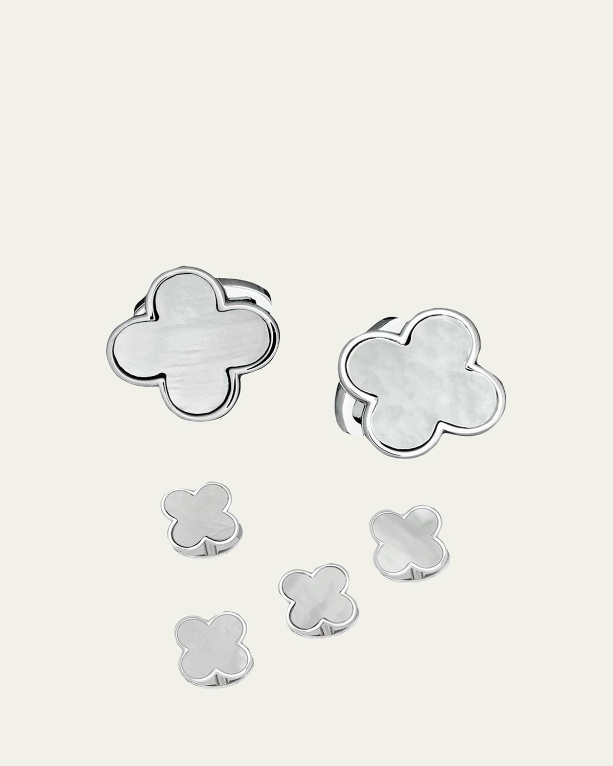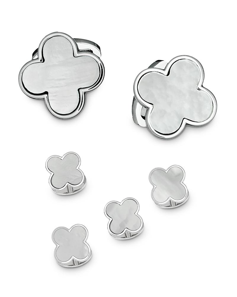 Luminous mother-of-pearl adorns this polished cufflinks and shirt studs set, crafted in a lucky four-leaf clover shape. Includes two cufflinks and four shirt studs Mother-of-pearl Sterling silver Whale back Imported SIZE Cufflinks: 0.7W Studs: 0.4W. Men Accessories - Jewelry > Jan Leslie > Saks Fifth Avenue > Barneys. Jan Leslie.