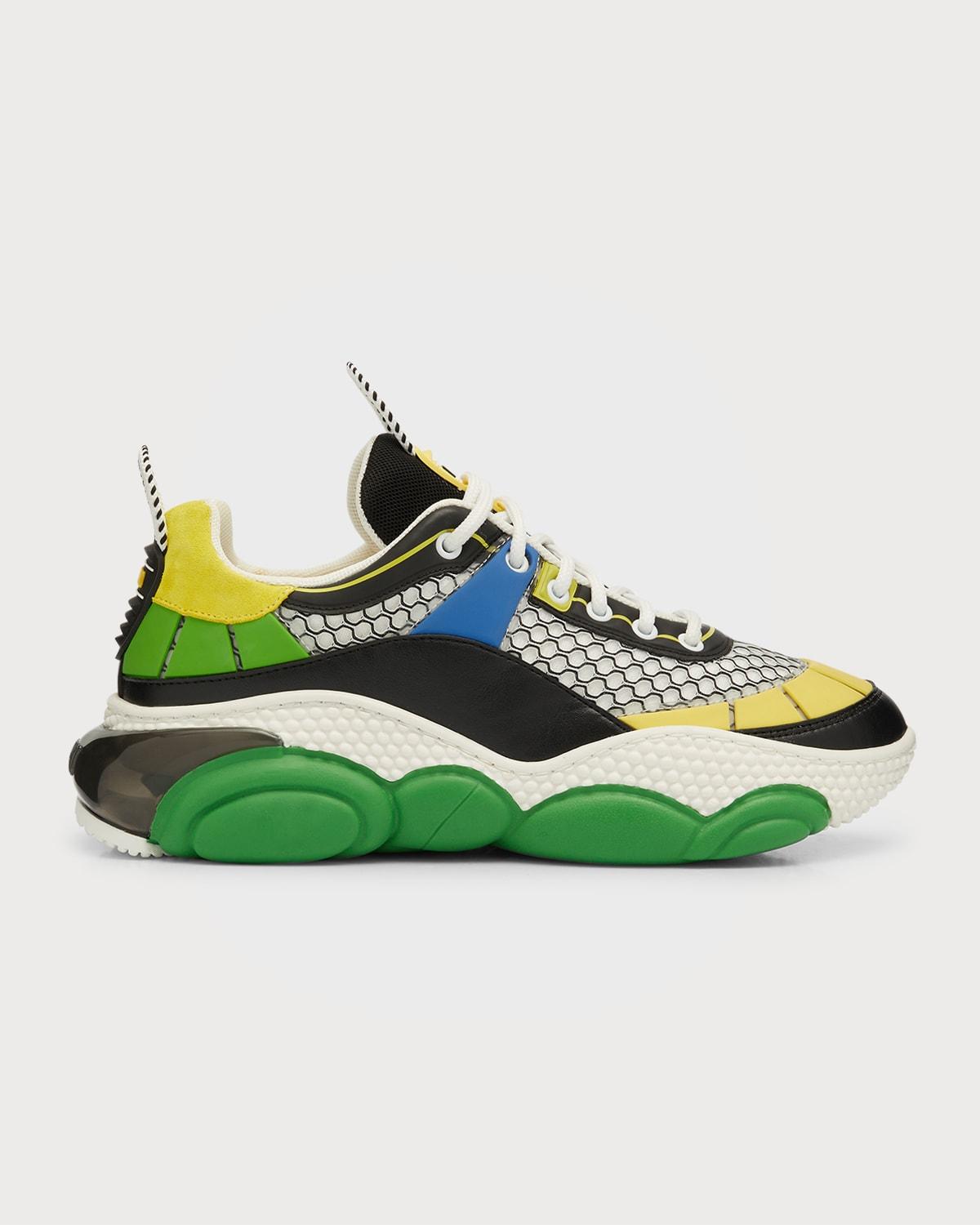 Moschino mesh fashion sneakers with contrasting rubber overlays Flat chunky heel Reinforced round toe Lace-up vamp Rubber logo appliqué and bicolor pull tab at tongue and backstay Padded collar Polyester lining Transparent maxi bubble heel; embossed logo Iconic Teddy Bear-shaped rubber outsole Made in Italy