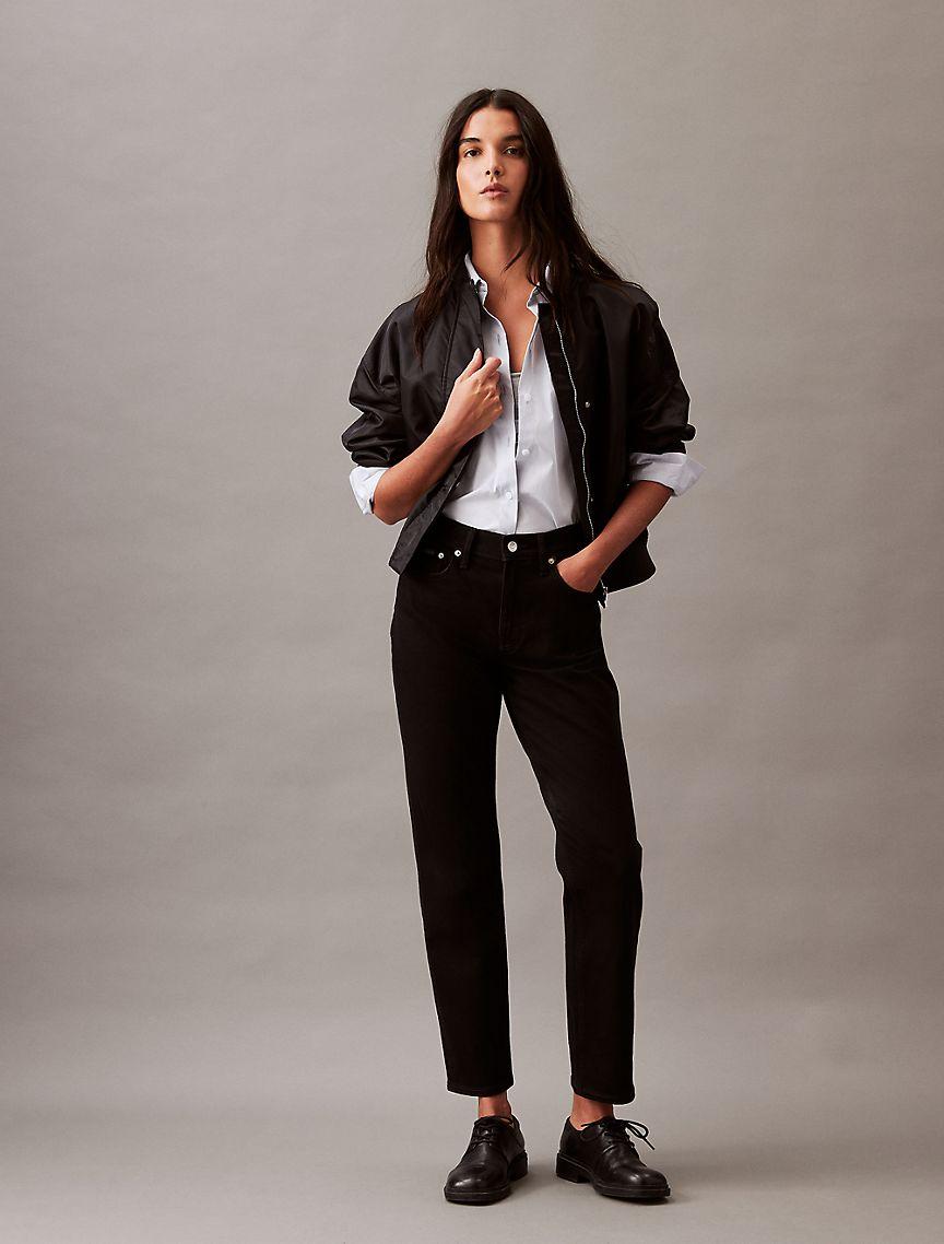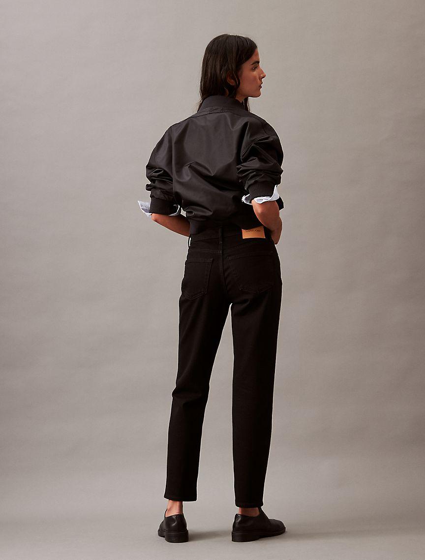 Styled in a straight leg silhouette with a mid rise waist, these jeans are made from a cotton stretch blend for easy, comfortable wear. Designed with a zip fly and a top button closure. Features classic 5-pocket styling and finished with a Calvin Klein logo patch at the back waist.