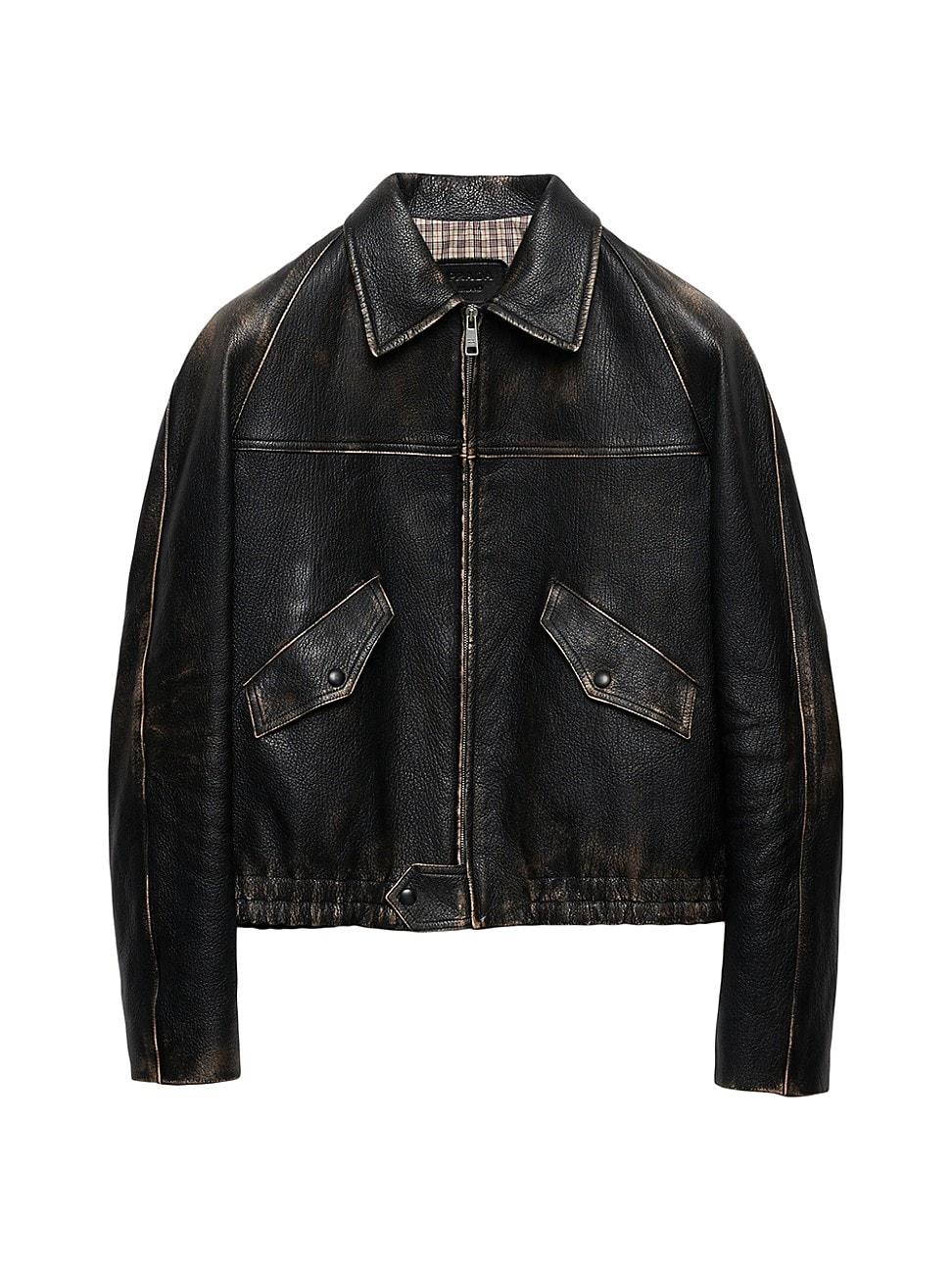 This jacket with a sophisticated silhouette and details combines contemporary stylistic codes and superb craftsmanship. The style is enriched by a process on the finished garment that adds dimension to the soft feel of the nappa leather, emphasized with an aged effect. The leather triangle logo reinterpreted with a conceptual design completes the casual garment. Lined Nappa Leather Regular fit Center zipper closure Shirt-style collar Straight sleeves Flap pockets Elasticized hem Leather triangle logo on the back Bleaching treatment on finished garment Imported. Lsd Rtw - Prada Rtw > Prada > Saks Fifth Avenue > Barneys. Prada. Color: Black. Size: 50.