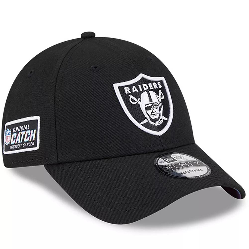Intercept cancer with the 2023 NFL Crucial Catch Collection from New Era. In the spirit of various cancer ribbon colors, this 9FORTY Adjustable Hat features an embroidered Las Vegas Raiders logo at the front panels and a patterned undervisor. It also consists of the leagues Crucial Catch logo at the right-wear side on a woven label and a snapback closure at the rear. The NFL does not profit from the sale of Crucial Catch products. Charitable contributions are awarded by the NFL Foundation to the American Cancer Society. For more information, please visit www.NFL.com/CrucialCatch.Intercept cancer with the 2023 NFL Crucial Catch Collection from New Era. In the spirit of various cancer ribbon colors, this 9FORTY Adjustable Hat features an embroidered Las Vegas Raiders logo at the front panels and a patterned undervisor. It also consists of the leagues Crucial Catch logo at the right-wear side on a woven label and a snapback closure at the rear. The NFL does not profit from the sale of Crucial Catch products. Charitable contributions are awarded by the NFL Foundation to the American Cancer Society. For more information, please visit www.NFL.com/CrucialCatch.PRODUCT FEATURESImportedStructured fitOfficially licensedSix panel construction with eyeletsSurface washableSnap ClosureMid CrownCurved billBrand: New EraOne size fits mostMaterial: 100% PolyesterRaised embroidered graphics Size: One Size. Color: Black. Gender: male. Age Group: adult.