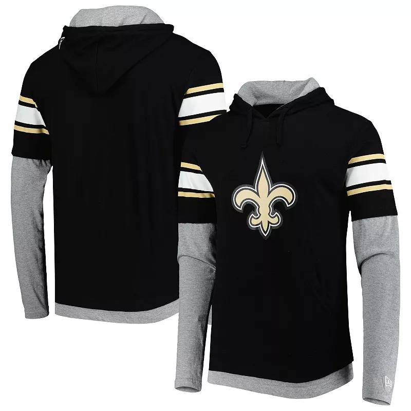 Fend off the cold in this New Orleans Saints long sleeve hoodie T-shirt from New Era. It features authentic team graphics printed on soft fabric for a crisp game day look. An adjustable hood and traditional pouch pocket also deliver extra warmth when needed at the New Orleans Saints stadium.Fend off the cold in this New Orleans Saints long sleeve hoodie T-shirt from New Era. It features authentic team graphics printed on soft fabric for a crisp game day look. An adjustable hood and traditional pouch pocket also deliver extra warmth when needed at the New Orleans Saints stadium.Long sleeveImportedBrand: New EraOfficially licensedMaterial: 100% CottonHood with drawstringMachine wash, tumble dry lowScreen print graphicsFront pouch pocketTagless Collar Color: SNT BLACK. Gender: male. Age Group: adult.