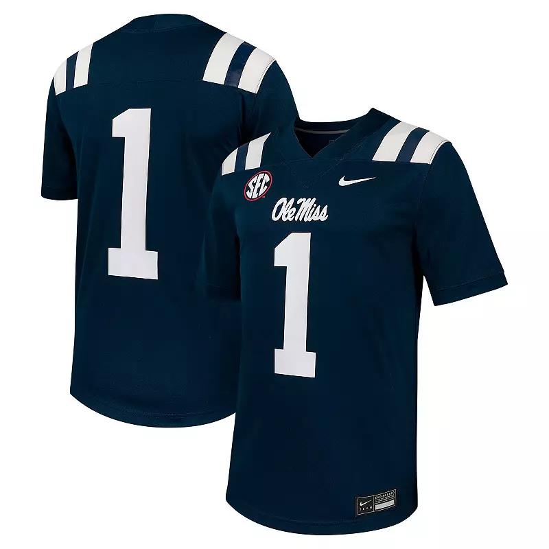 Prepare to cheer on your Ole Miss Rebels with this sharp # Untouchable Football Jersey from Nike. This Ole Miss Rebels jersey boasts a loose fit, allowing for comfortable movement on and off the field. The combination of stitched fabric applique at the collar and a satin woven jock tag adds a touch of sophistication to this classic football jersey.Prepare to cheer on your Ole Miss Rebels with this sharp # Untouchable Football Jersey from Nike. This Ole Miss Rebels jersey boasts a loose fit, allowing for comfortable movement on and off the field. The combination of stitched fabric applique at the collar and a satin woven jock tag adds a touch of sophistication to this classic football jersey.PRODUCT FEATURESHeat-sealed graphicsSatin woven jock tagNike GameStitched fabric applique at collarMachine wash, tumble dry lowOfficially licensedMaterial: 100% PolyesterBrand: NikeShort sleeveLoose fitImported Color: Navy. Gender: male. Age Group: adult. Material: Cotton.