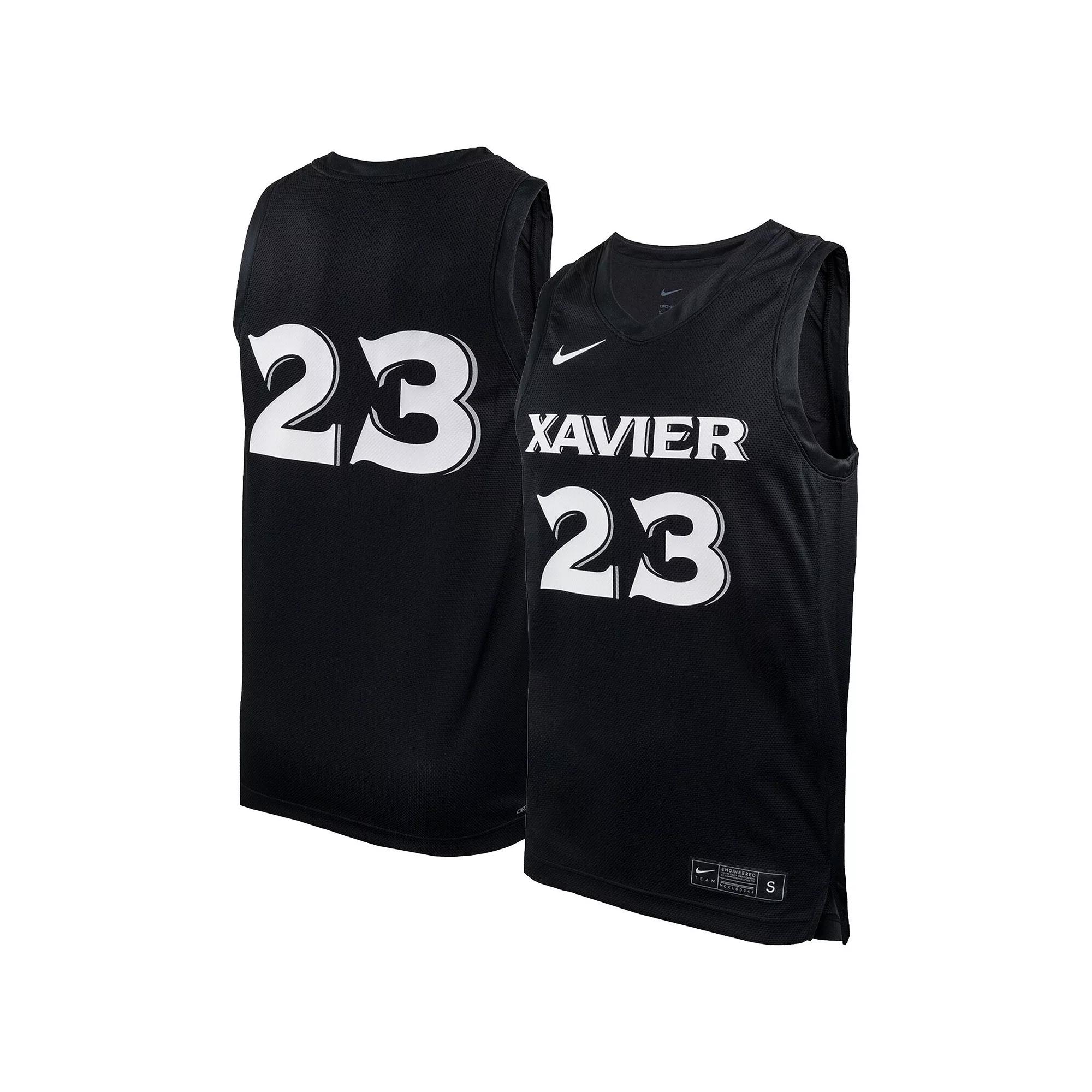 Rep the Xavier with confidence in this Replica Jersey. Along with its lightweight polyester, this jersey is designed with sweat-wicking technology to help keep you dry and comfortable for all 40 minutes of action. Benefits: Nike Dri-FIT technology moves sweat away from your skin for quicker evaporation, helping you stay dry and comfortable. Rounded drop-tail hem helps provide proper coverage. Product Details: 100% polyester. Machine wash. Imported. Style: FN5200459T4; Color: Black; Size: L; Gender: Male; Age Group: Adult | Xavier Replica Men's Nike College Basketball Jersey in Black, Size: Large | FN5200459T4-XAV