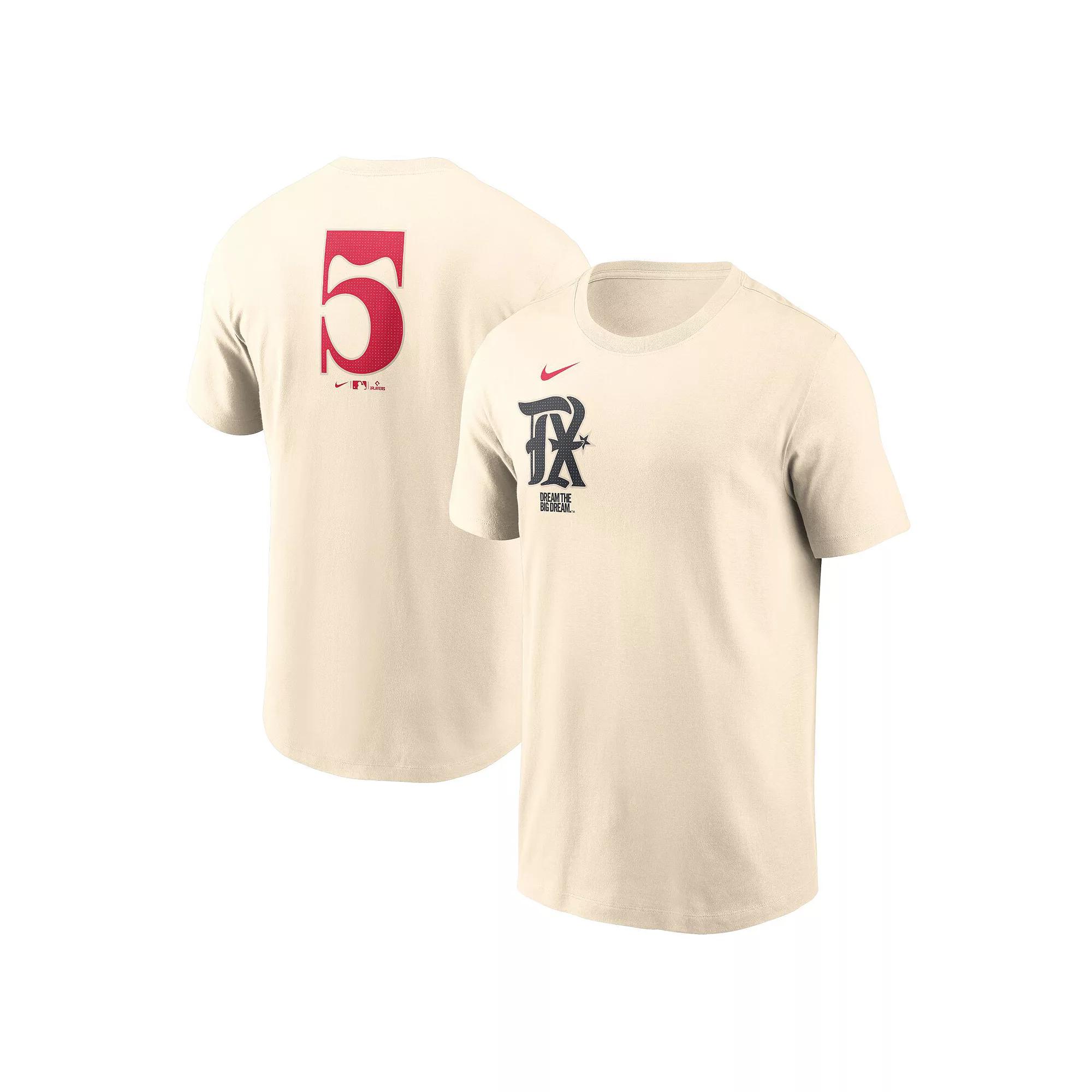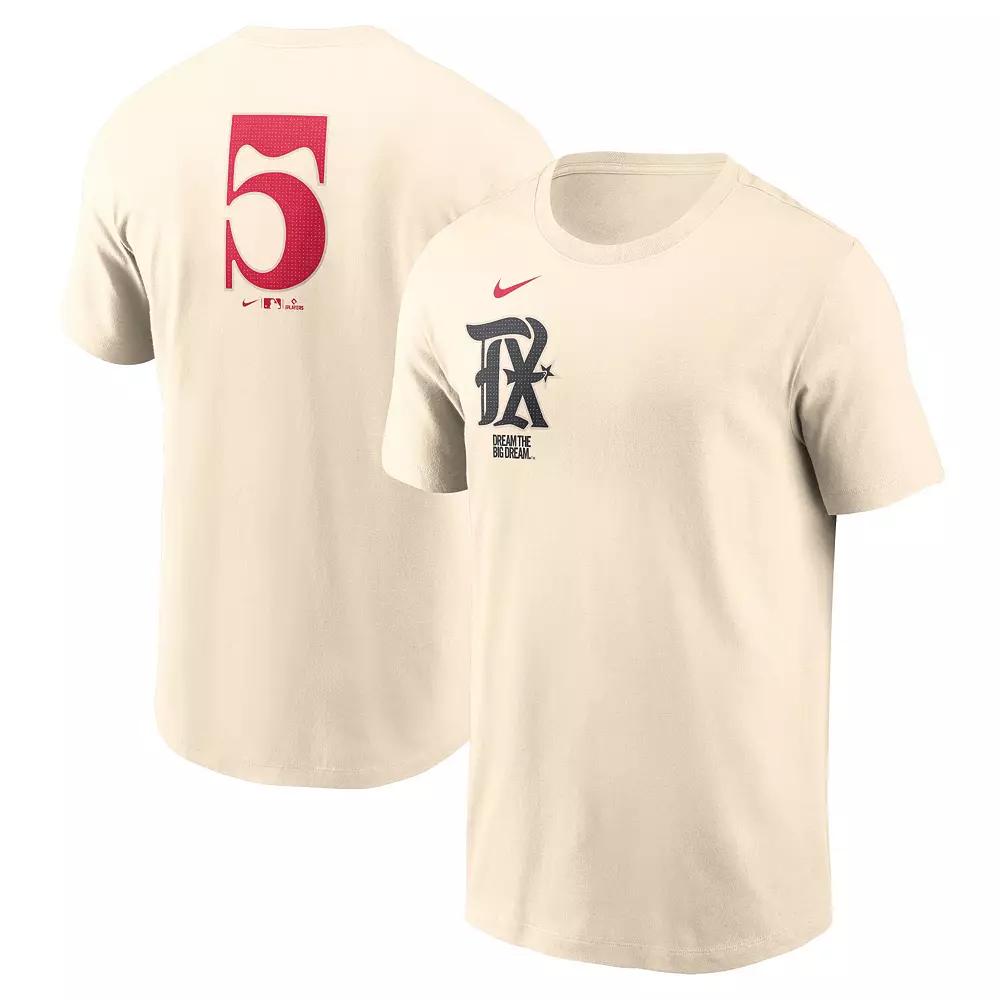 Embrace the Texas Rangers City Connect spirit with this Corey Seager Fuse Name & Number T-Shirt from Nike. The screen print graphics celebrate the surrounding Texas cities as well as Corey Seagers signature number 5 to proudly display your Rangers fandom. This tee is a must-have for any die-hard fan of the Texas Rangers.Embrace the Texas Rangers City Connect spirit with this Corey Seager Fuse Name & Number T-Shirt from Nike. The screen print graphics celebrate the surrounding Texas cities as well as Corey Seagers signature number 5 to proudly display your Rangers fandom. This tee is a must-have for any die-hard fan of the Texas Rangers.PRODUCT FEATURESMaterial: 100% CottonBrand: NikeShort sleeveImportedMachine wash, tumble dry lowScreen print graphicsCrew neckOfficially licensed Size: 2XL. Color: Beige. Gender: male. Age Group: adult.