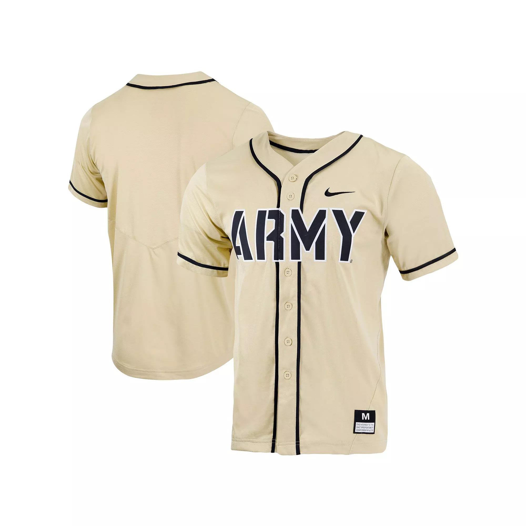 Looking for a way to highlight your unwavering passion for the Army Black Knights? Your search is over, because this replica full-button baseball jersey from Nike will help you do just that. With crisp Army Black Knights graphics, you can guarantee everyone will see your die-hard fandom. Its also built with Dri-FIT technology, which will keep you comfortable by wicking moisture away from your body.Looking for a way to highlight your unwavering passion for the Army Black Knights? Your search is over, because this replica full-button baseball jersey from Nike will help you do just that. With crisp Army Black Knights graphics, you can guarantee everyone will see your die-hard fandom. Its also built with Dri-FIT technology, which will keep you comfortable by wicking moisture away from your body.PRODUCT FEATURESReplica JerseyNike Dry fabrics move sweat from your skin for quicker evaporationhelping you stay dry, comfortable and focused on the task at handDri-FIT technology wicks away moistureTackle twill applique graphicsWoven jock tagRounded droptail hemShort sleevesOfficially licensedImportedMachine wash, tumble dry lowMaterial: 100% PolyesterBrand: NikeFull-button frontEmbroidered graphics Size: 2XL. Color: NC2 GOLD. Gender: male. Age Group: adult. Material: COTTON.