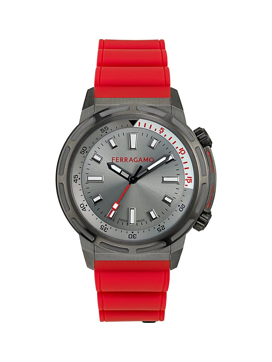 Ferragamo mens sports watch 46mm; round IP gunmetal stainless steel case Sapphire crystal glass Grey sunray dial Logo at 12 oclock Recycled polyurethane strap Adjustable buckle Quartz movement Water resistant at 20 ATM Spot clean Made in Switzerland