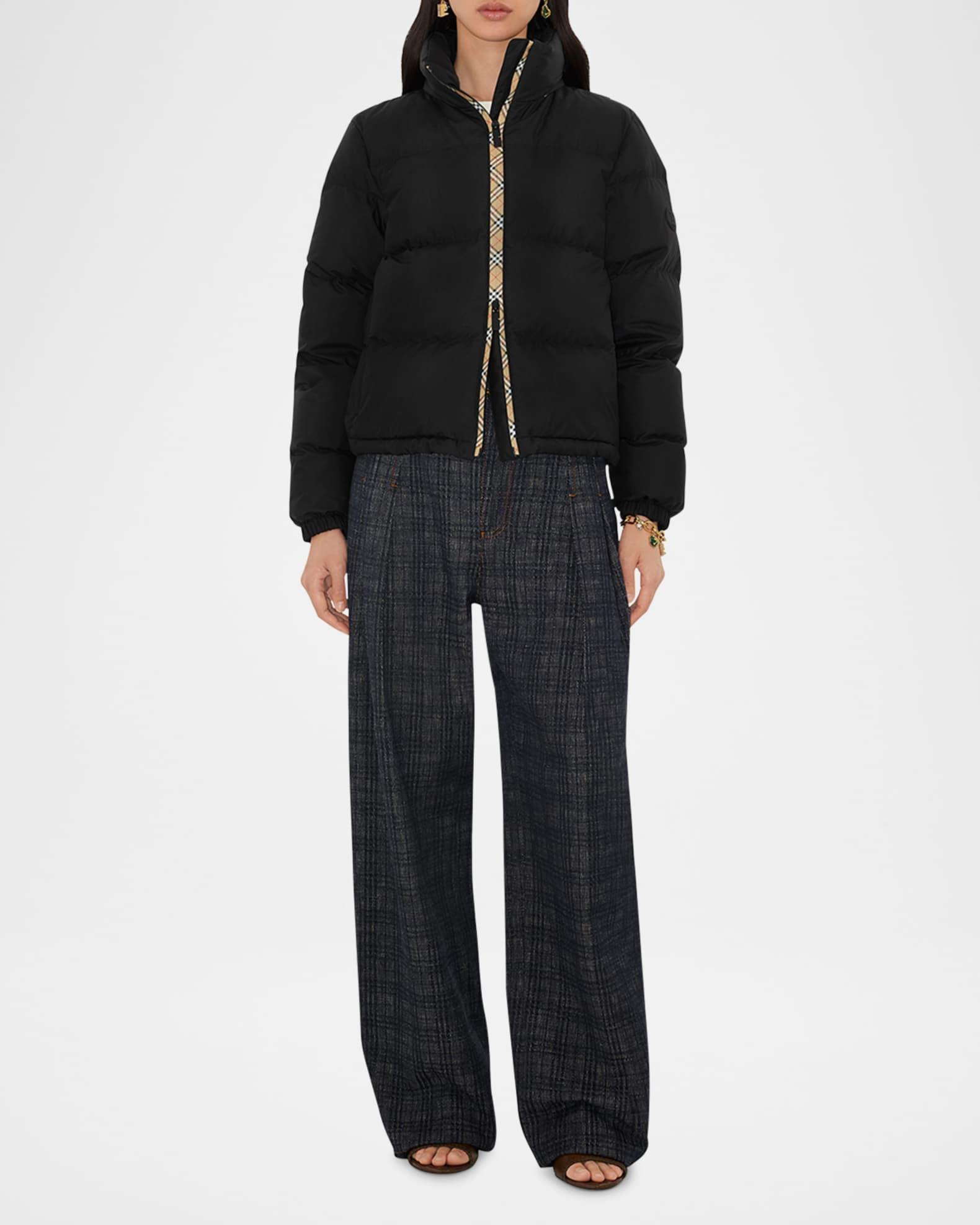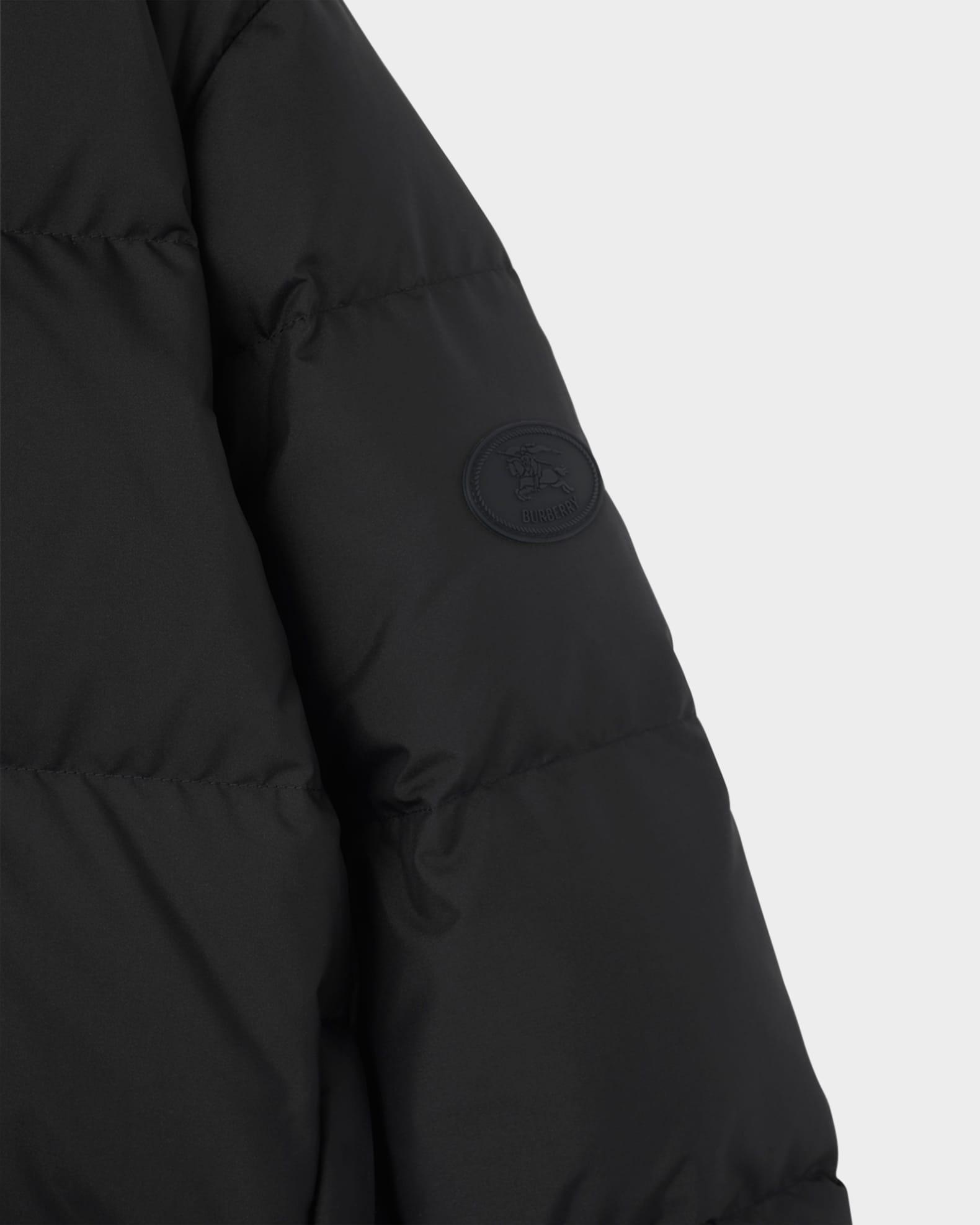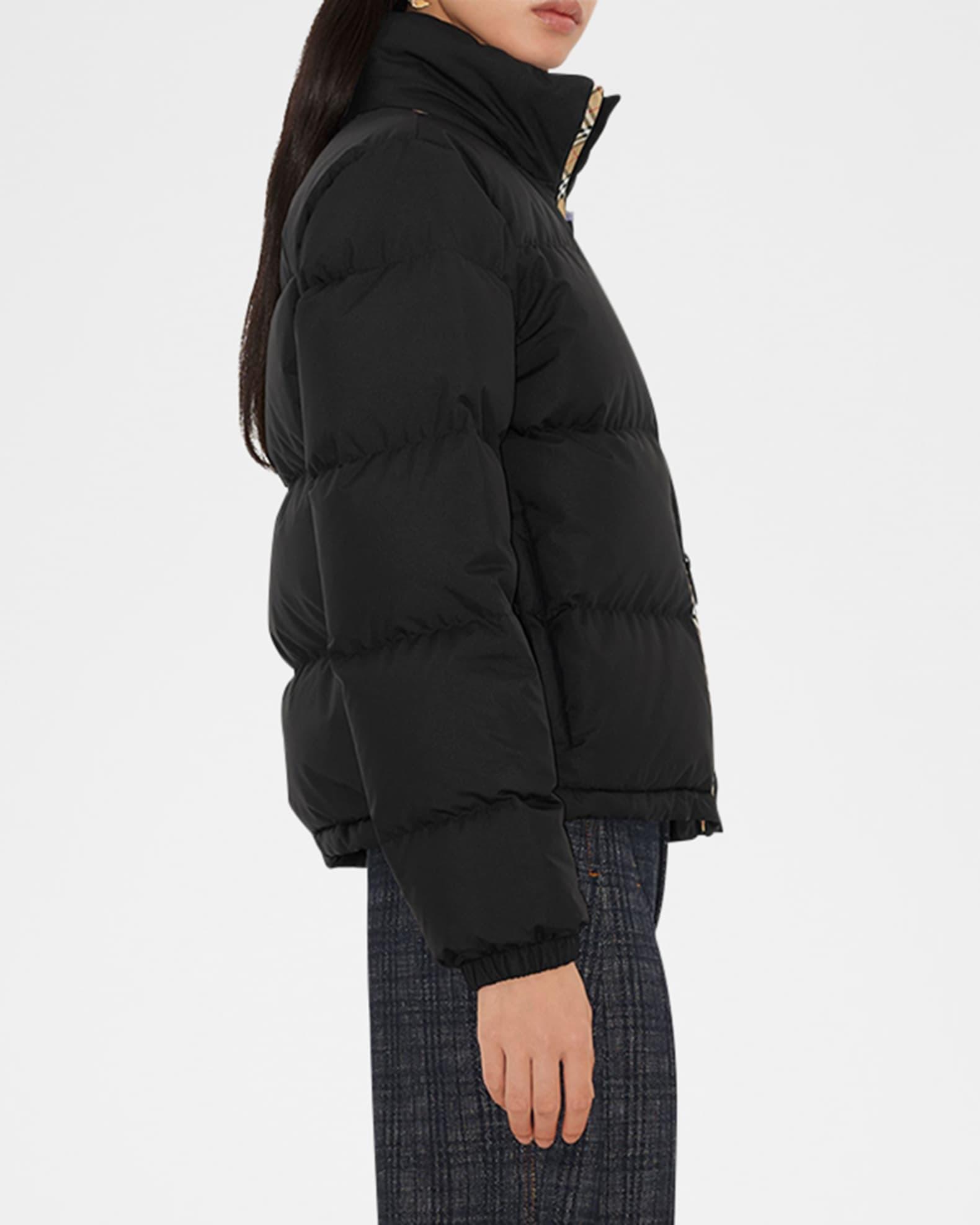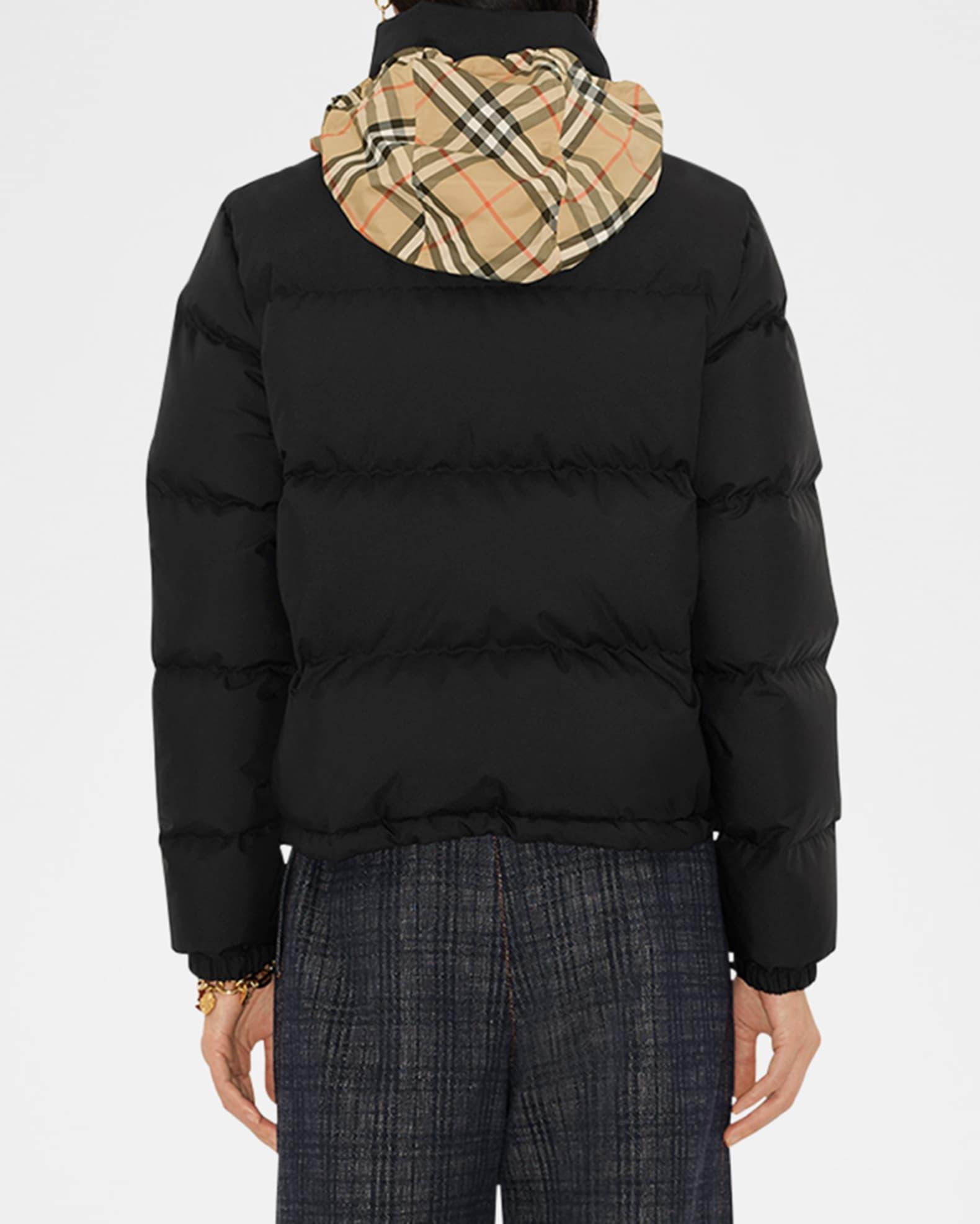 Burberry "Ambleside" puffer jacket featuring a signature check printed zipper and hidden hood Stand collar; two-way zip front Long sleeves; banded cuffs Logo patch on left sleeve Hip welt pockets Boxy fit Hip length Polyester Fill: Polyester/Down Made in Italy