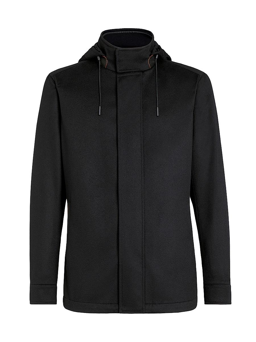 Showcasing Zegnas uncompromising approach to natural materials, the Oasi Cashmere Elements hooded Cima overjacket continues a tradition of luxury outerwear. Soft, lightweight cashmere lends its characteristic elegance to the contemporary silhouette. Distinctive leather details sign off the look. Regular fit Stand collar with hood Zip and button closure Open hem Leather details and drawstring Welt pockets Water-repellent 74 cm length on size 48 Main body: 100% Cashmere Leather details: Calfskin