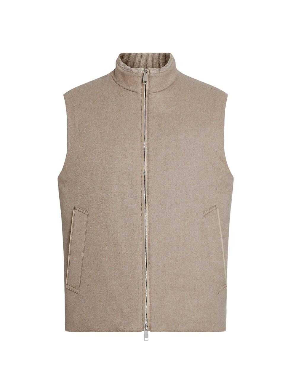 Sleek and functional, the Oasi Cashmere Elements vest is a versatile addition to any elevated wardrobe. Padded with warm goose down and feathers, this classic design is made water-repellent thanks to a Zegnas innovative technology: the exclusive cashmere fabric is enhanced with a special membrane. The zip-up vest is styled with a knit yoke and knit lining inside the stand collar. This Oasi Cashmere Collection garment is crafted from soft cashmere thats specially treated with a water repellent finish - a tribute to our founders legacy of textile innovation. We commit to certifying Oasi Cashmere fibres as 100% traceable from 2024. Regular fit Stand collar with knit lining Zip closure Open hem Knit yoke Leather details Straight welt pockets Goose down and feather padding Water repellent Slightly felted fabric 68 cm length on size 48 Main body: 100% Cashmere Leather details: Calfskin Lining: 100% Cotton Padding: 90% Goose Down, 10% Feather Do not wash. Do not bleach. Do not tumble dry. Iron at max 110C. Professional dry cleaning in hydrocarbons, mild process. Professional leather clean only. Protect leather details before washing Made in Italy. Lsd Mens - Zegna Rtw > Zegna > Saks Fifth Avenue > Barneys. ZEGNA. Color: Light Taupe. Size: 40.