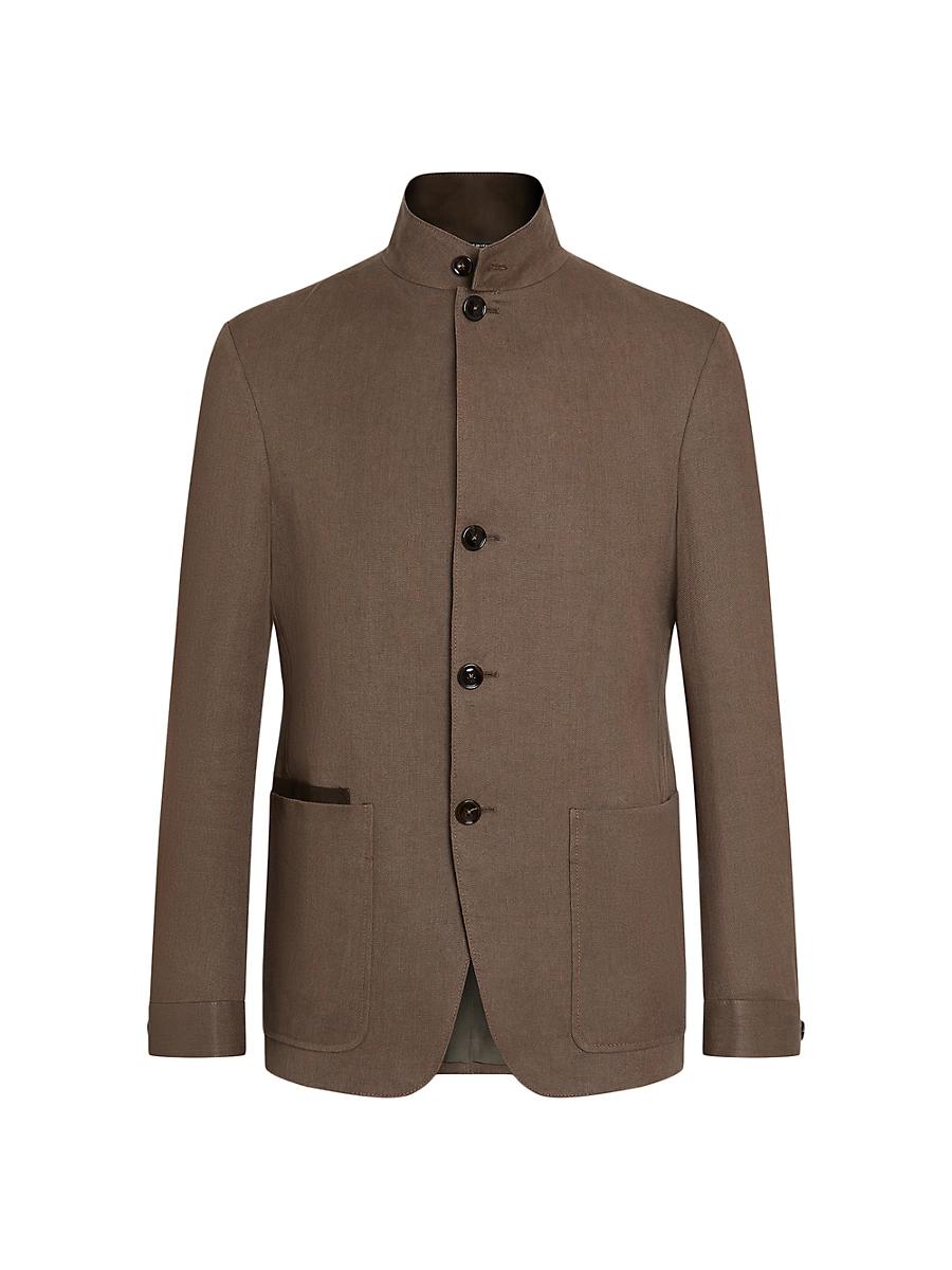 Bring the authentic elegance of pure linen to formal looks with this Oasi Lino chore jacket. Regular fit Tailoring chore jacket Single vent Guru collar Leather details Button closure Patch pockets Deconstructed, fused Lined 73 cm length on size 48 Made in Italy FABRIC DETAILS Main body: 100% Linen Leather details: Calf Leather The inspiration behind this Oasi Lino garment was Born in Oasi Zegna, a 100km natural territory and the home of our values. Crafted from European-grown flax fibres that are certified as 100% traceable from 2024, Oasi Lino follows in the footsteps of our founder, who envisioned a vertically integrated system of producing textiles Do not wash. Do not bleach. Do not tumble dry. Professional dry cleaning in tetrachloroethene and hydrocarbons, mild process. Lsd Mens - Zegna Rtw > Zegna > Saks Fifth Avenue > Barneys. ZEGNA. Color: Dark Brown. Size: 38.