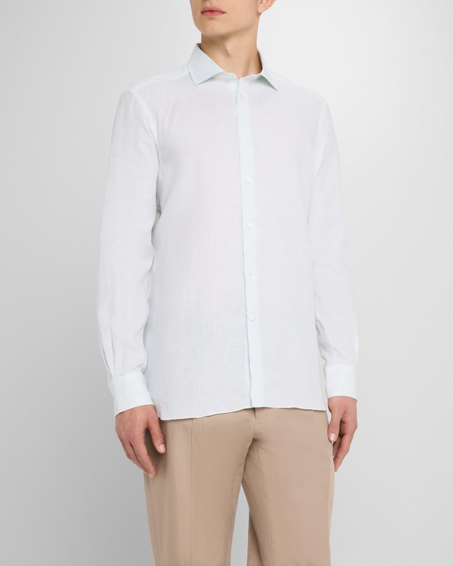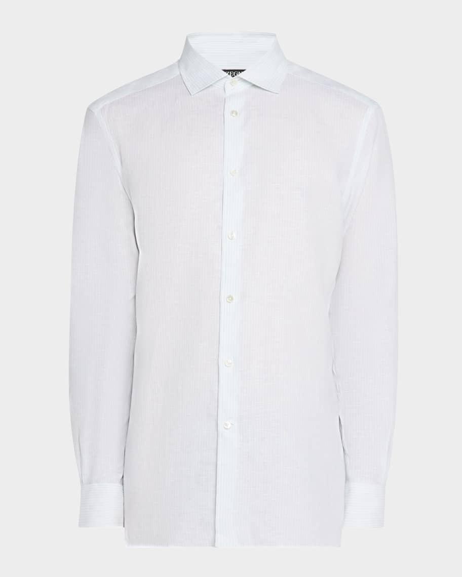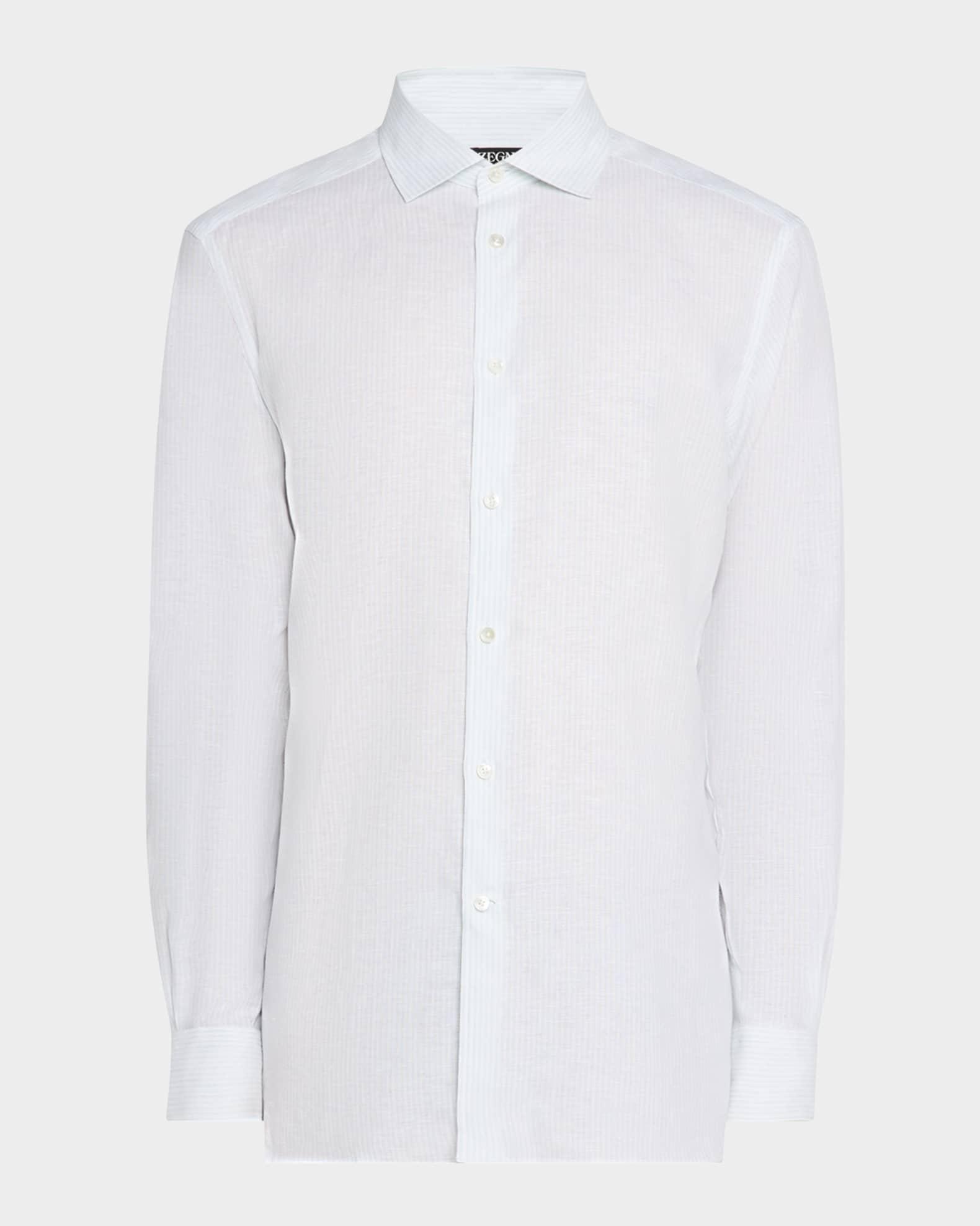 ZEGNA sport shirt in breathable Oasi Lino fabric showcasing a subtle pinstripe print Oasi Lino is crafted exclusively from European-grown flax fibres that are certified as 100% traceable Spread collar Button placket Long sleeves Round barrel cuffs Back yoke Shirttail hem Linen Dry clean Made in Italy