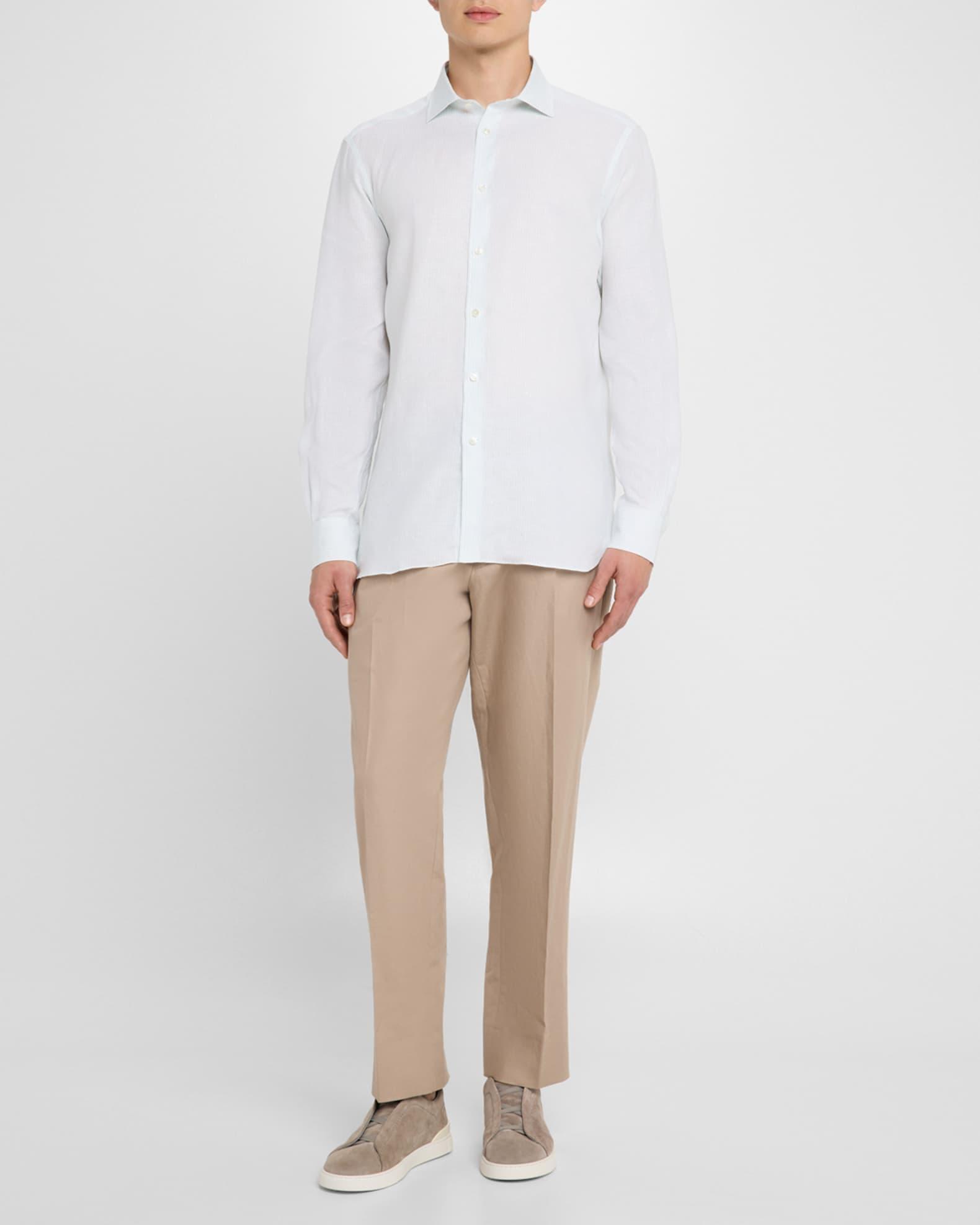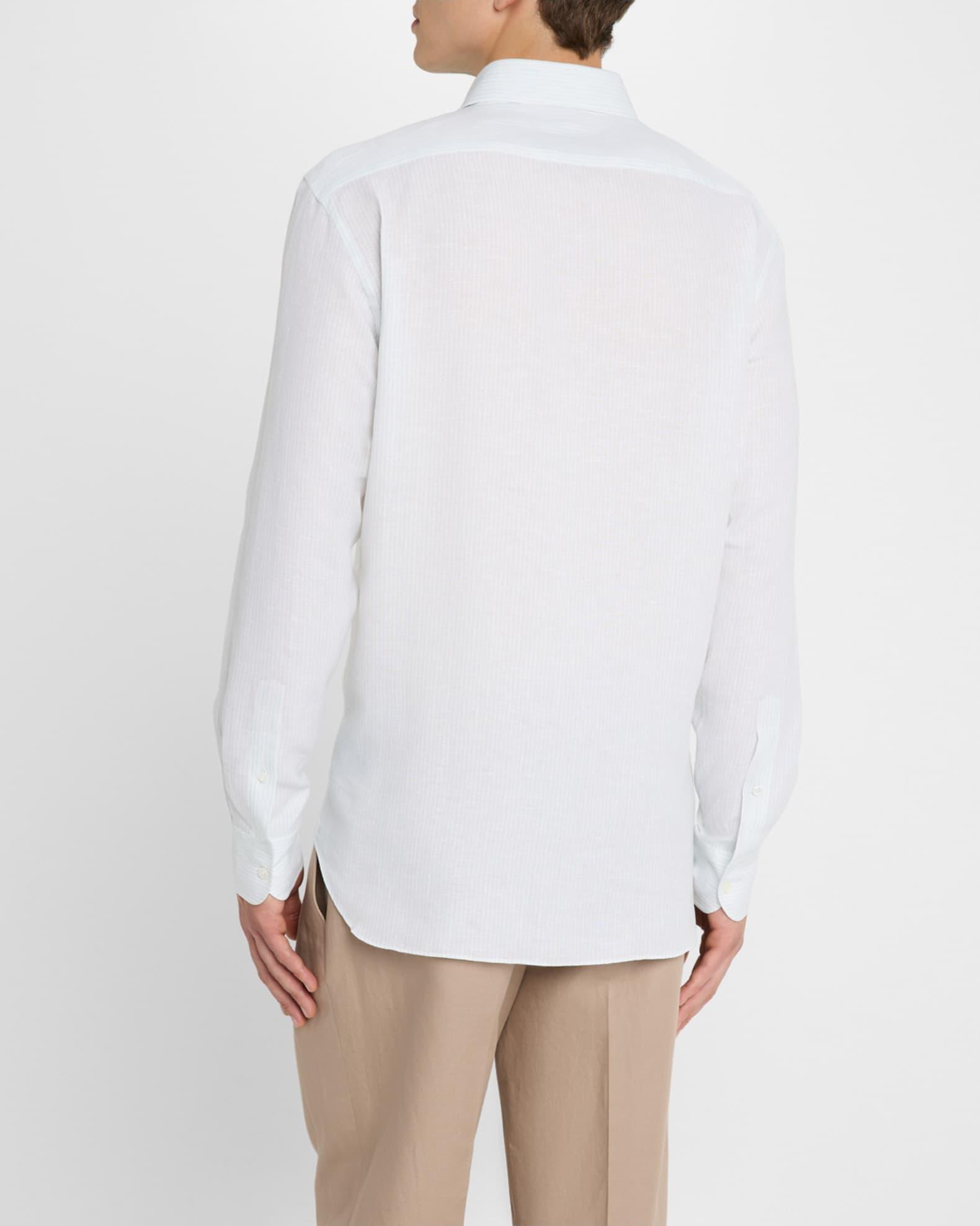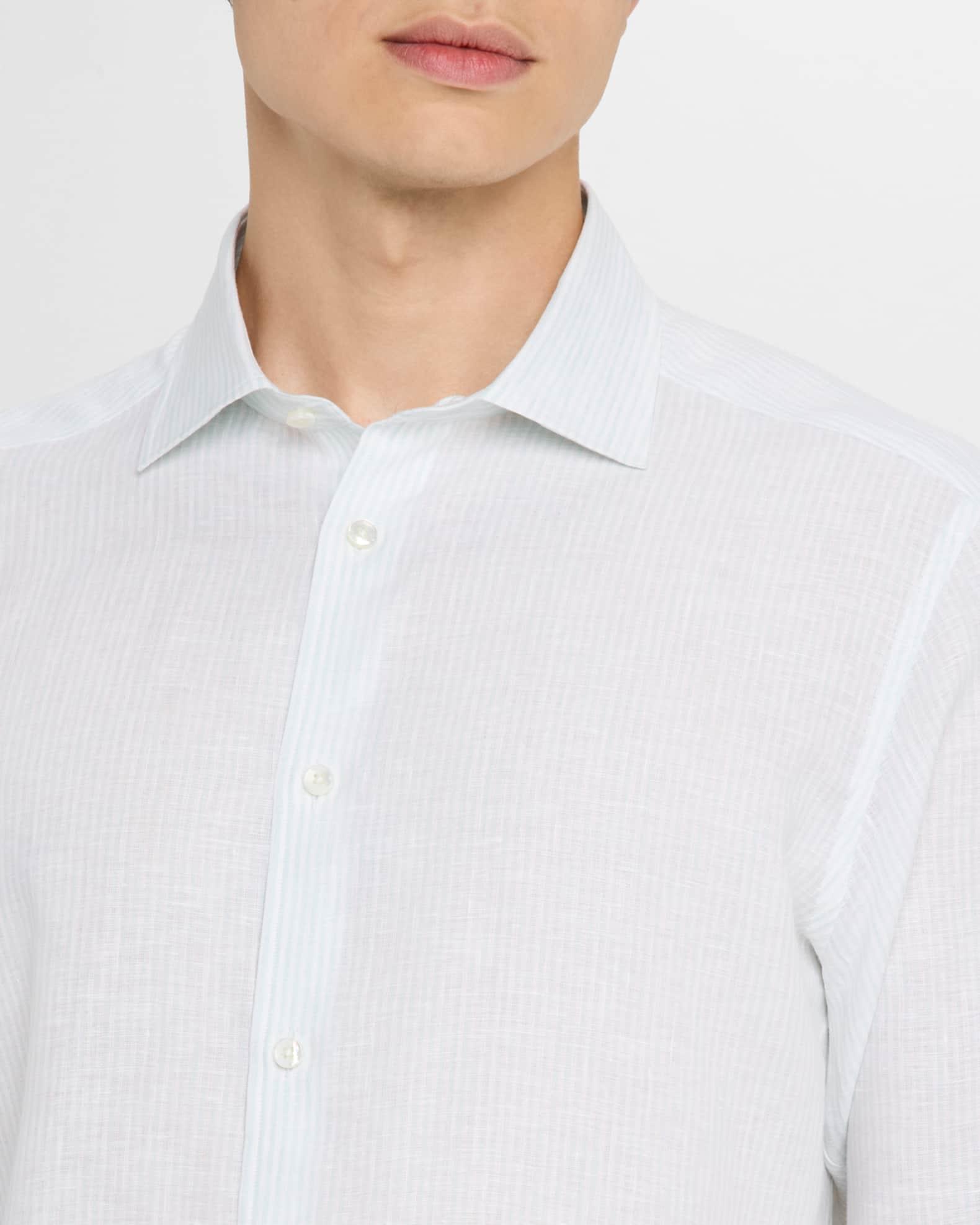 ZEGNA sport shirt in breathable Oasi Lino fabric showcasing a subtle pinstripe print Oasi Lino is crafted exclusively from European-grown flax fibres that are certified as 100% traceable Spread collar Button placket Long sleeves Round barrel cuffs Back yoke Shirttail hem Linen Dry clean Made in Italy