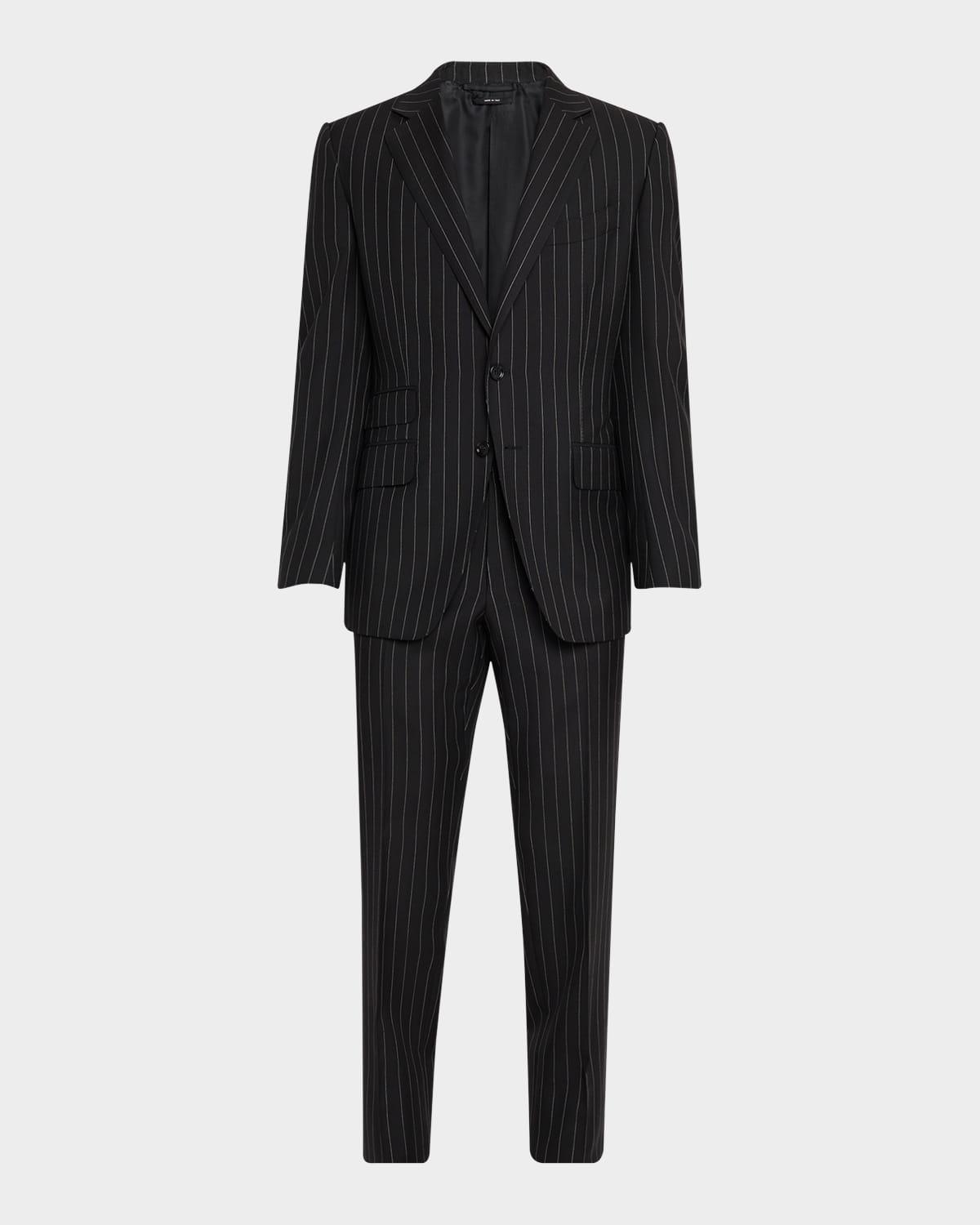 TOM FORD "O'Connor" suit in sharp stripes Virgin wool Professional cleaning recommended Made in Italy Jacket: Notch lapels; buttonhole at left lapel Two-button closure Chest welt pocket Hip flap pockets Interior besom pocket Ticket pocket Unfinished sleeves Double-vented back Trousers: Regular rise Side adjuster tabs Flat front Side slip pockets Back welt pockets Full length Unfinished hem to be tailored to desired length