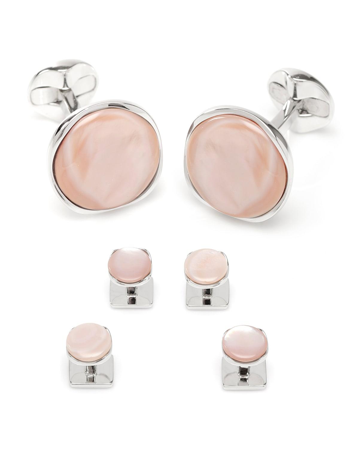 Cufflinks Inc. set of two round cufflinks and four shirt studs. Polished sterling silver hardware. Opulent pink mother-of-pearl insets. Engraved backs. Imported.