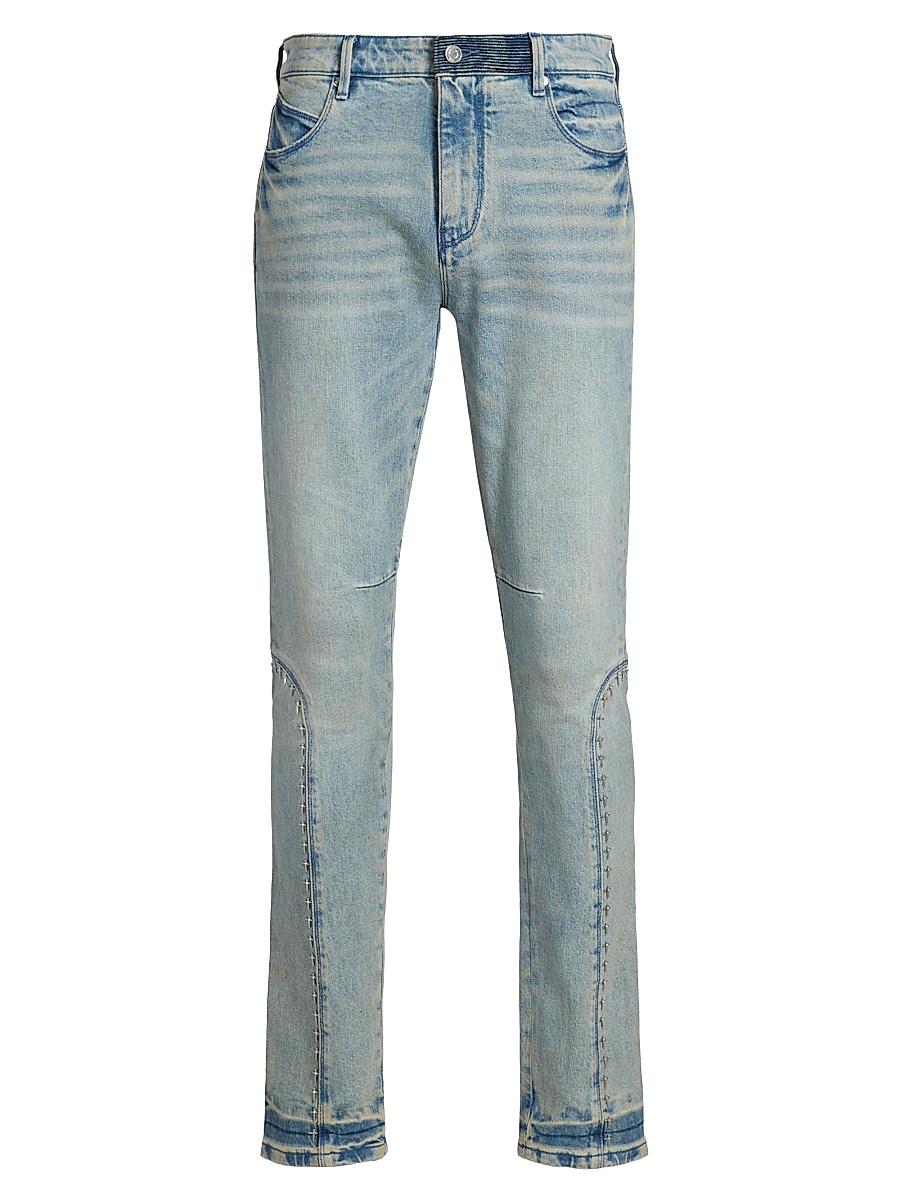 From the Paradise Vice Collection. Crafted of stretch denim, these Enzo jeans from RTA are cut in a skinny silhouette with metallic cross hardware at the calves. Distressed detailing, whiskering, and a released hem lend a worn-in feel to this five-pocket pair. Five-pocket style Zip fly, button closure 99% cotton/ 1%spandex Hand wash Imported SIZE & FIT Rise: about 10.5 Inseam: about 33 Leg opening: about 13 Model measurements: 62 tall, 40 chest, 31 waist Model is wearing a US size 32. Men