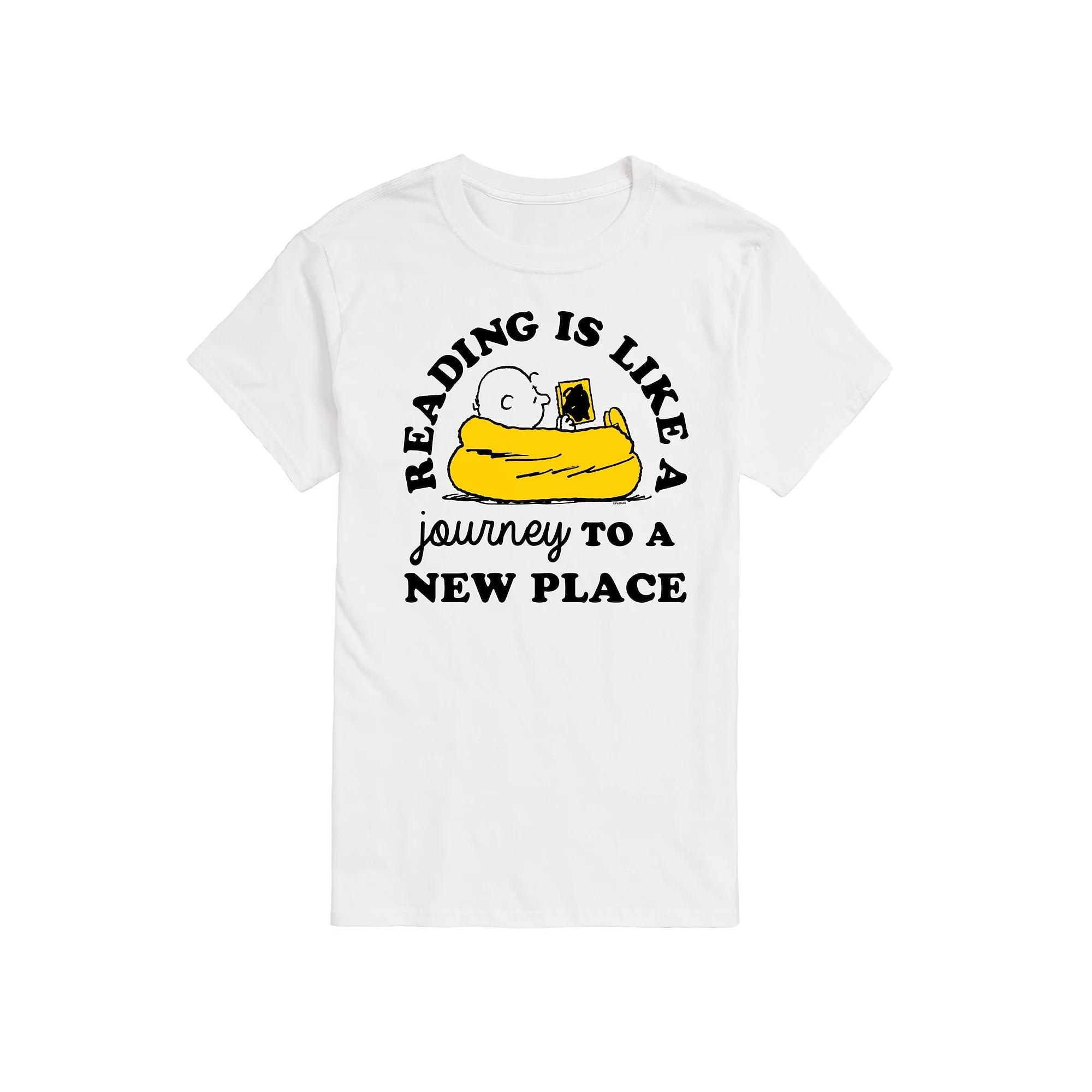 Hell love showing off his personal sense of style with this mens Peanuts Reading Is Like A Journey Graphic Tee. FEATURES Crewneck Short sleeveFABRIC & CARE Solid colors: cotton; Heather colors: cotton, polyester Machine wash Imported Color: White. Gender: male. Age Group: adult.