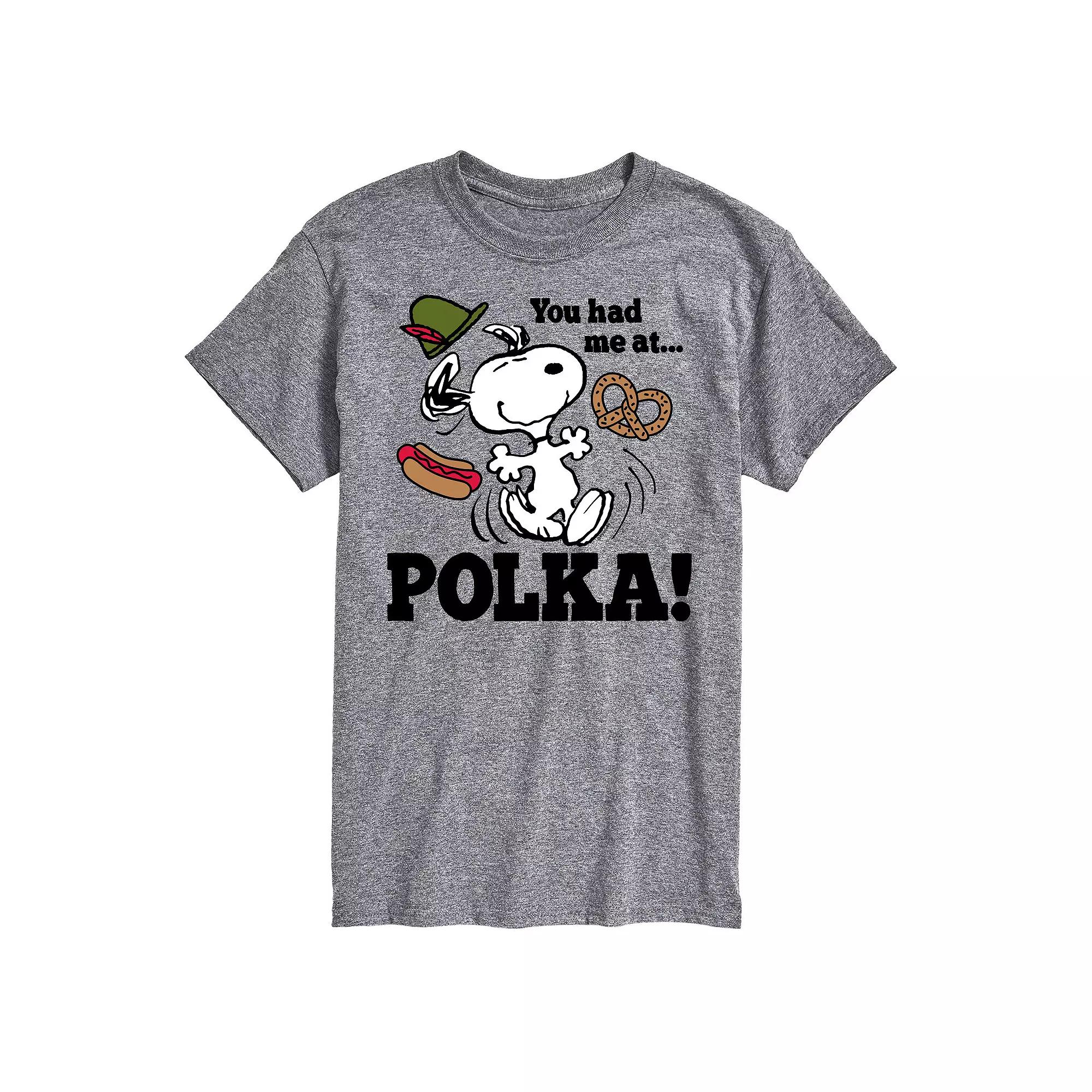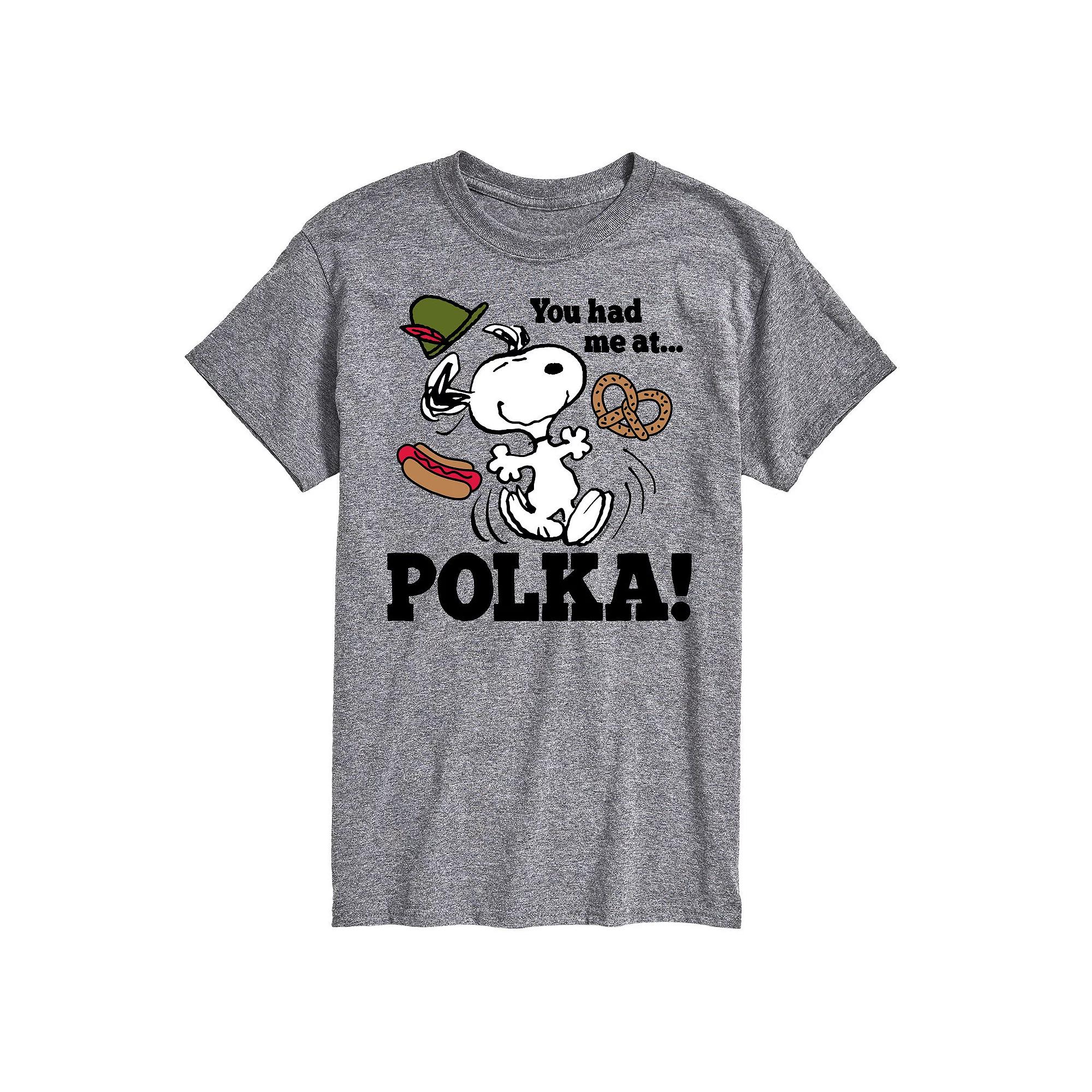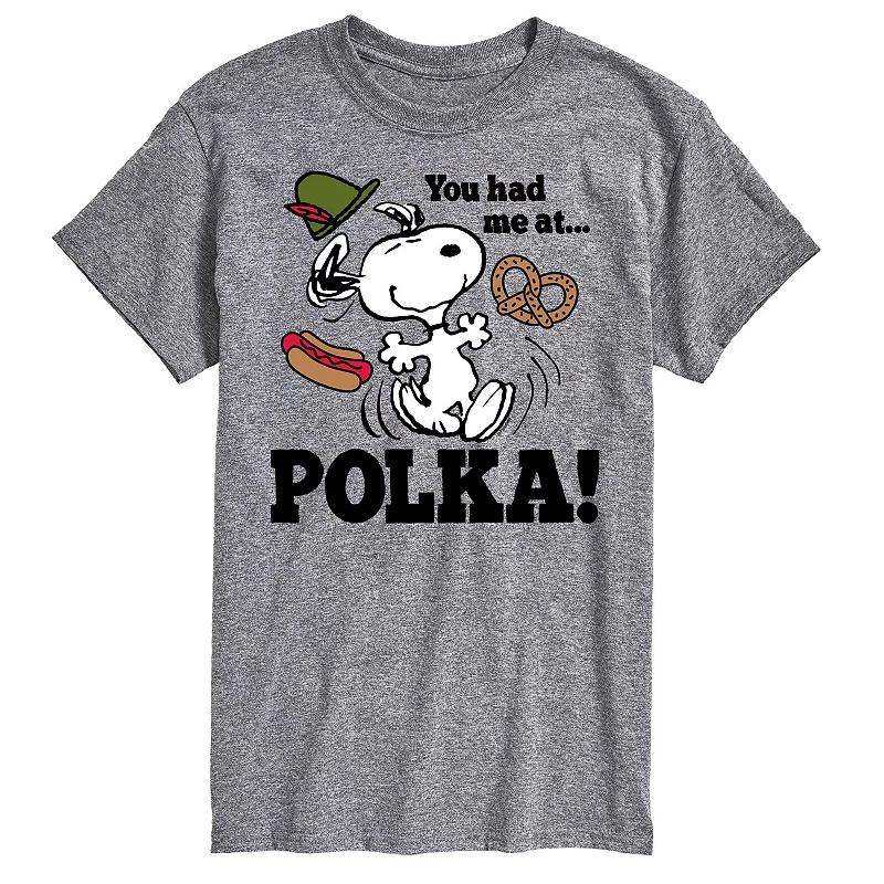 Athletic Heather Peanuts You Had Me at Polka Snoopy Tee - Men, Big & Tall. Graphic tee featuring breathable cotton-blend fabric. Full graphic text: You had me at polka!Size & fit: Unisex fit with a straight hem50% cotton / 50% polyesterMachine wash; tumble dryImported, screen printed in the USA