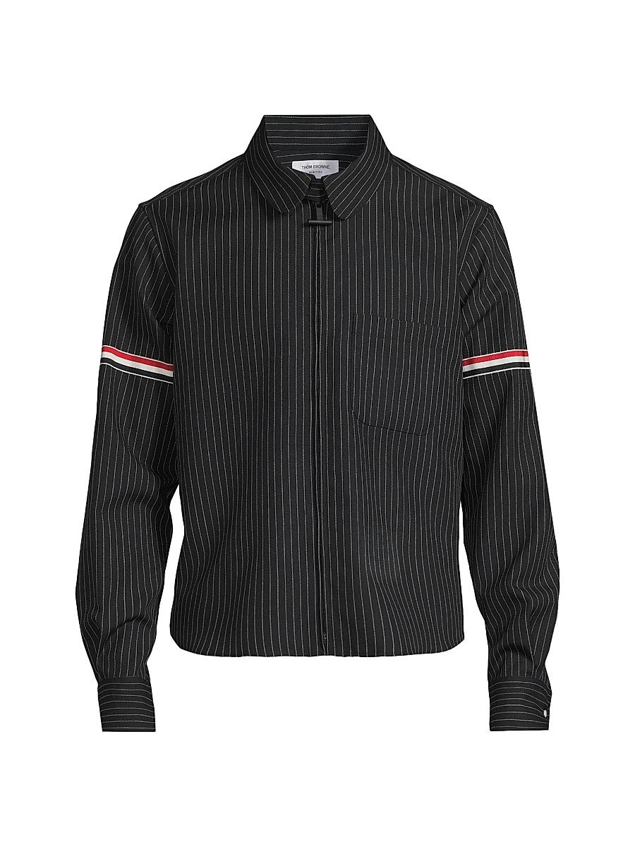 Crafted of a wool blend, this Thom Browne shirt flaunts a pinstriped motif and a suiting-inspired silhouette. A spread collar and patch pocket at the chest adorn this garment, which is finished with the brands iconic striped band at the left sleeve. Spread collar Long sleeves, button cuffs Chest patch pocket Front zip closure 97% virgin wool/3% polyester Dry clean Made in Italy SIZE & FIT Model measurements: 62 tall, 40 chest, 31 waist Model is wearing US size 2. Men Advcd Dsgnr - Advanced