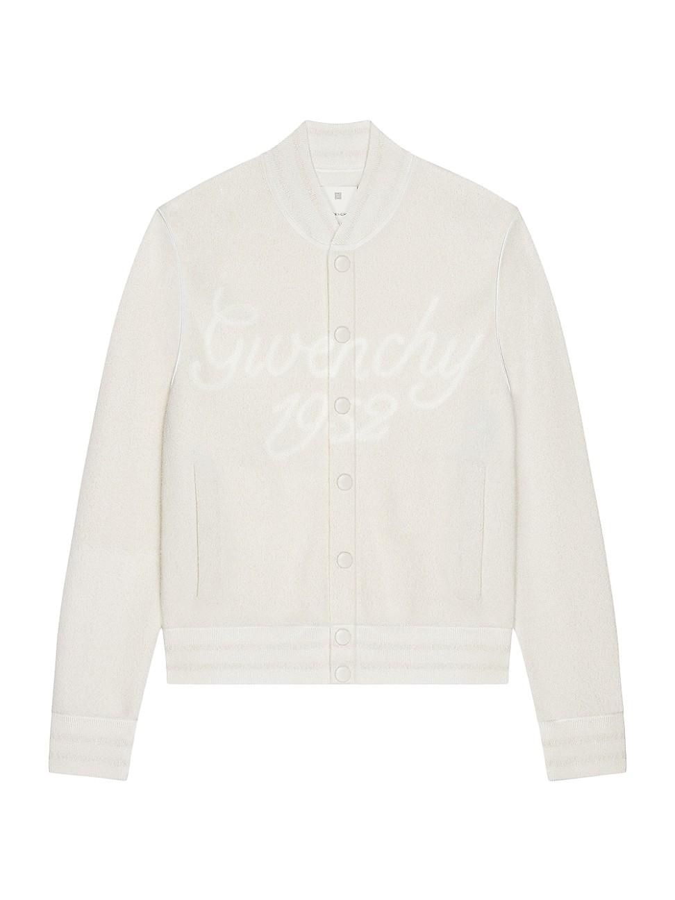Varsity jacket in knit. Varsity jacket in knit Small tone-on-tone Givenchy 1952 signature embroidered on the front Ribbed elastic knit collar, hem and cuffs Tone-on-tone snap closure Tone-on-tone piping detail Classic fit Composition: 50% polyamide, 50% cotton Imported. Lsd Rtw - Givenchy Rtw > Givenchy > Saks Fifth Avenue > Barneys. Givenchy. Color: Ivory. Size: Medium.